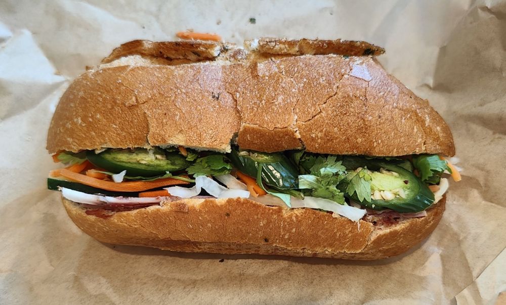 按谷哥:在越南菜中,banh mi(bánh mì或bánh m?)是一种短法棍面包(short baguette),现烤的外皮薄脆,口感柔软蓬松。它通常被纵向切开,里面填满肉和咸味食材,就像米国佬的潜水艇三明治(submarine sandwich)一样,作为一顿饭食用,被称为肉饼(bánh mì th?t)。单纯越南面包(plain bánh mì),不夹任何美味,也是常见主食(staple food)。