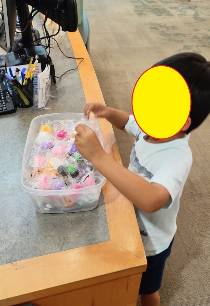 在克莱顿图书馆常有scavenger hunt(寻宝游戏),有奖的。核桃溪图书馆也有scavenger hunt。三世按图索骥,儿童翼四处搜寻宝物图案。找了半天,10来个图案还差2个。三世知道去向图书馆管理员要提示(hint)。