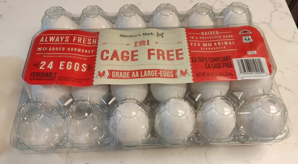 山姆诗有两款鸡蛋,都是山姆诗品牌(Member’s Mark):一款是褐色(棕红色)牧场放养A级鸡蛋,一打半装(18个)5刀多;另一款是的白色走地鸡蛋(cage free eggs),个头更大(双A级),一打只要1刀半,两打装(24个),只要3刀。