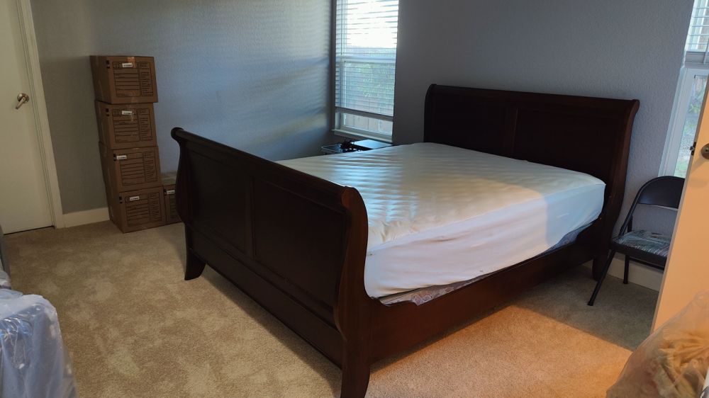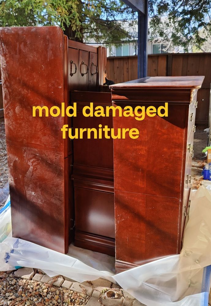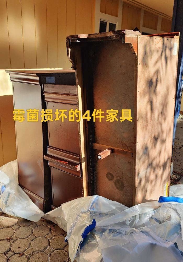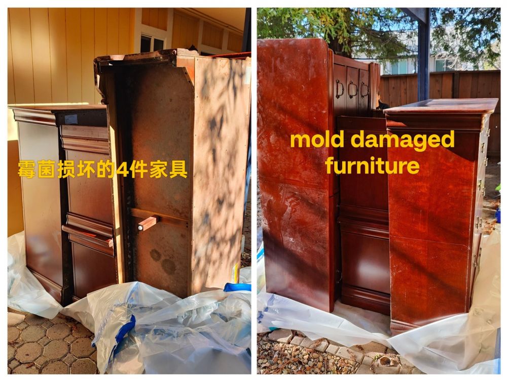 如前所述:我们从密州不远万里、千辛万苦搬来加州的一套五大件硬木家具,其中4件都被霉菌侵犯、报废了。目前在我家后院,塑料薄膜包裹的严严实实。只有这大床完好无损。