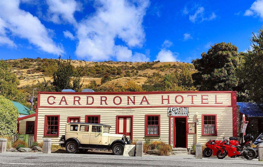 看摩托车后面的小牌牌,卡德罗纳酒店(Cardrona Hotel)建于1863年,名副其实的百年老店。