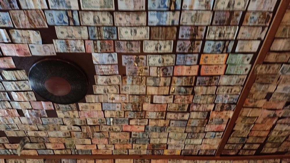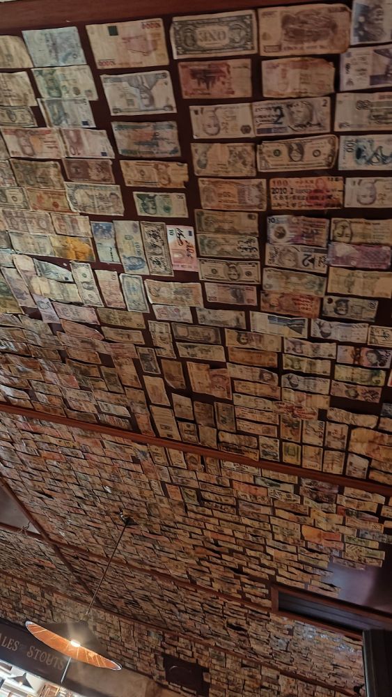 感觉更像个酒吧。天花板上花花绿绿钞票当时没留神,急着填肚子。