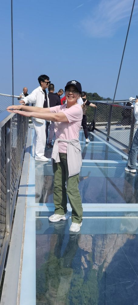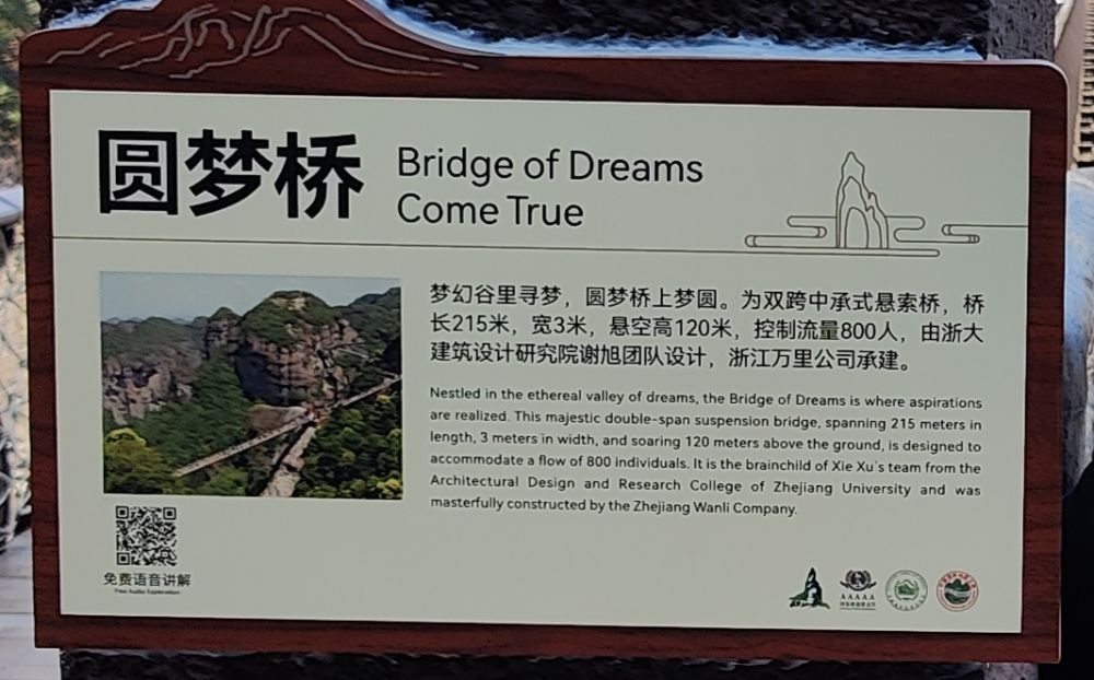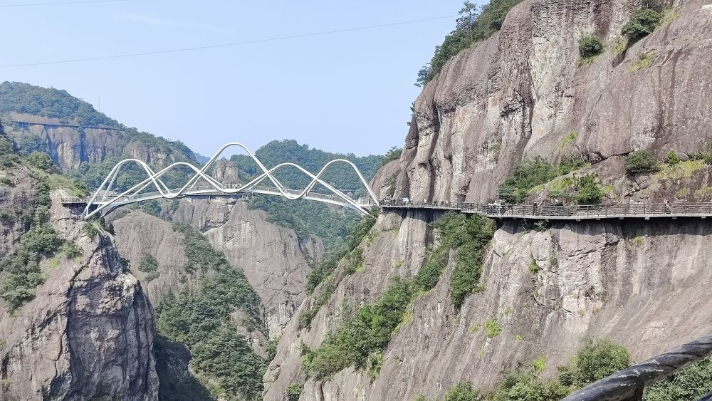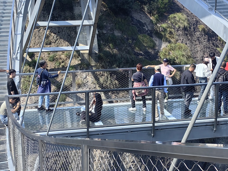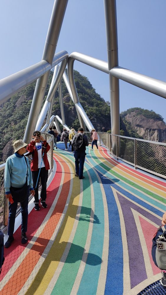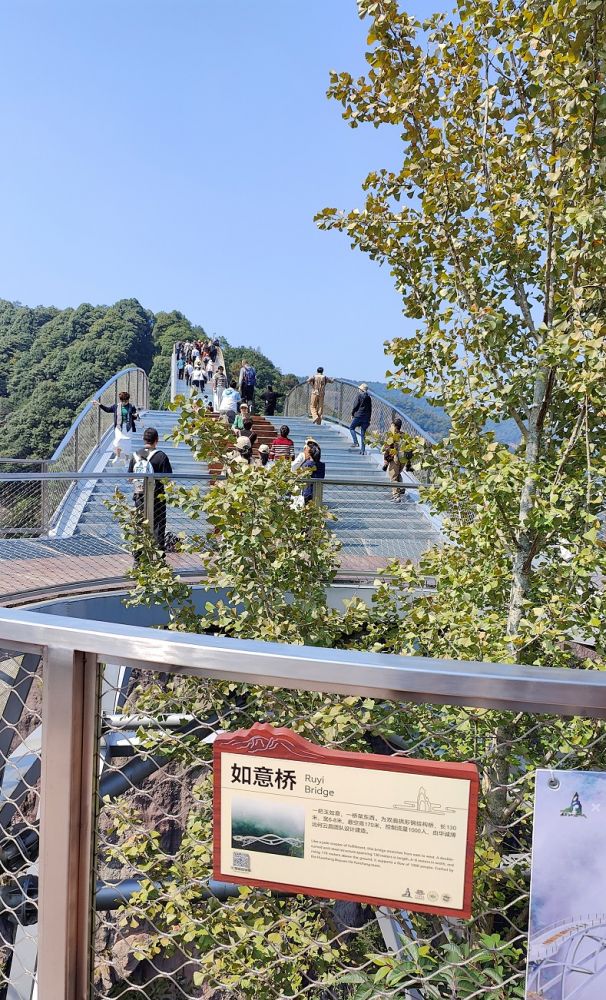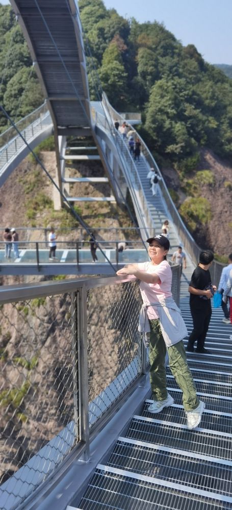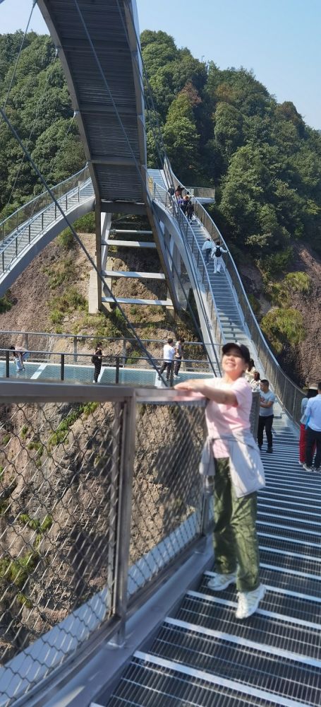 阿立注:卧龙桥上有几个长椭圆形的‘空间’:不是玻璃地面,而是细长金属条‘编织’的网状地面,可以看到千百米下的山间。绝对恐高的人大约不敢站上去。阿立虽然恐高,还未到最高级。这网状镂空桥面闭着眼走上去,然后睁眼看:也不过如此唛?!哈哈。