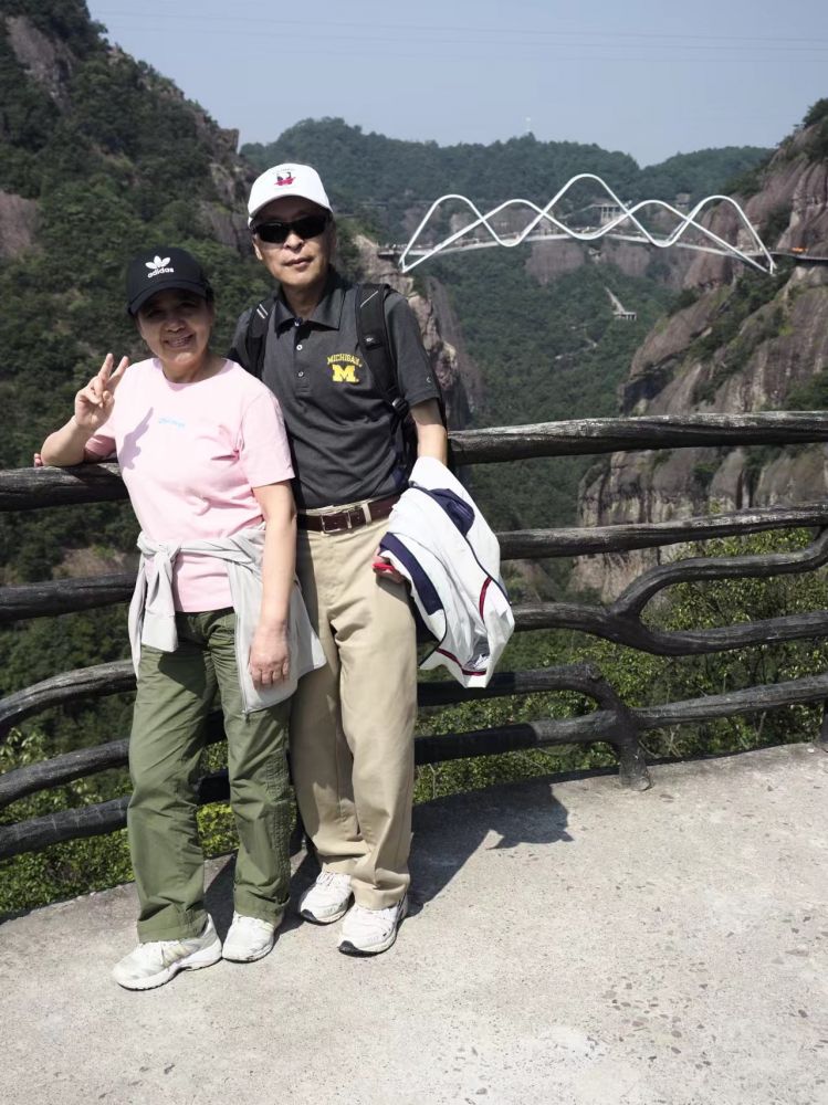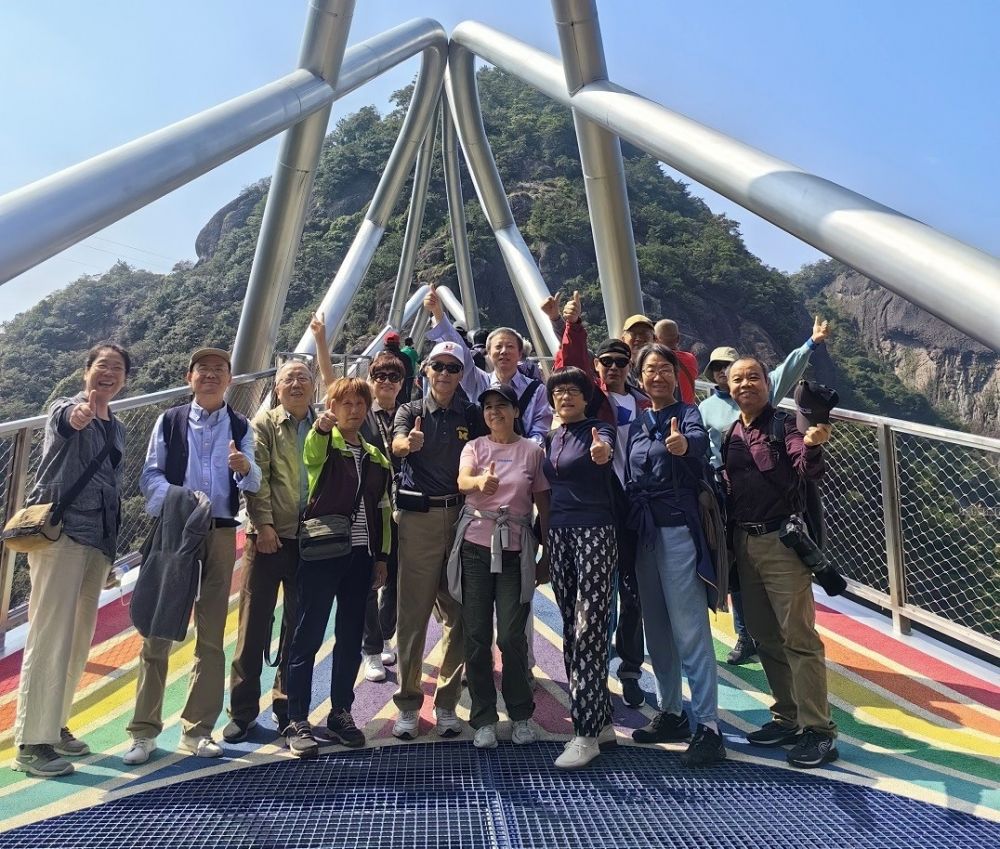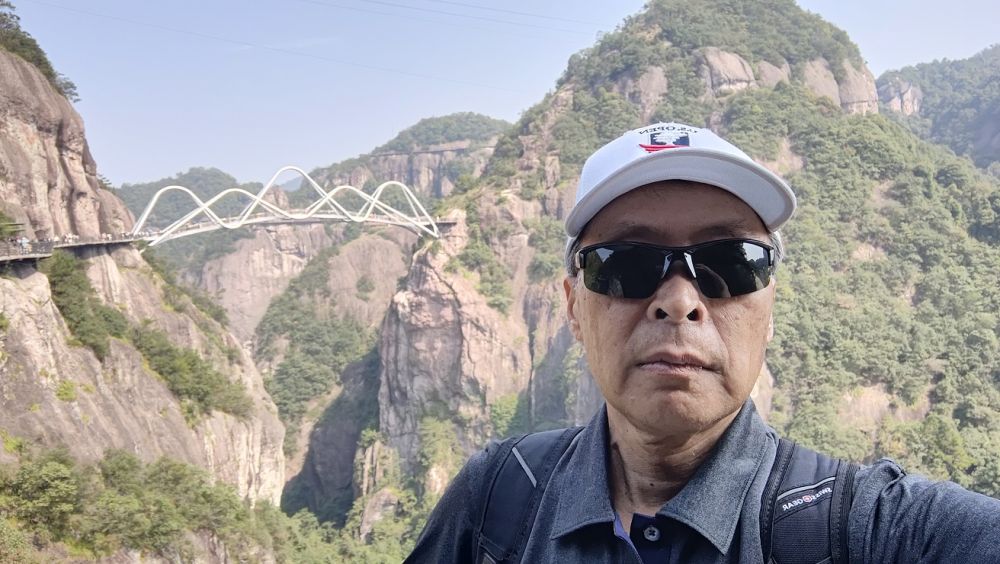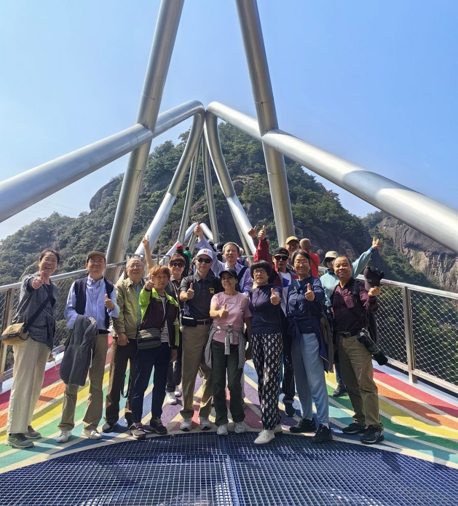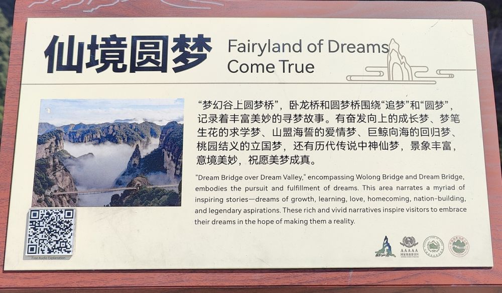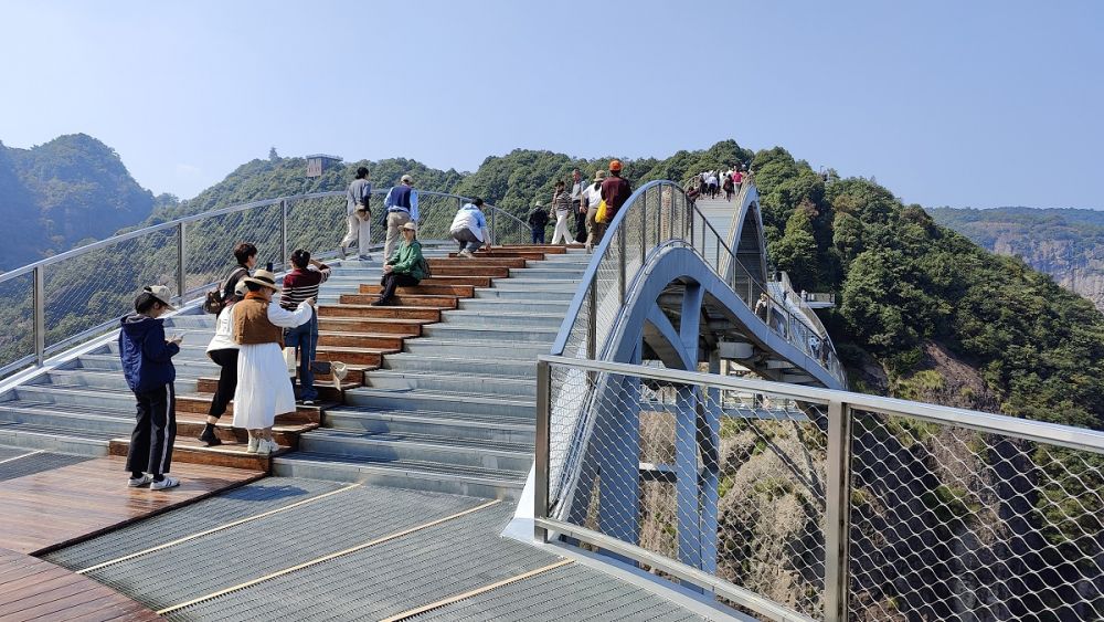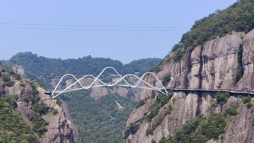 阿立注:卧龙桥上有几个长椭圆形的‘空间’:不是玻璃地面,而是细长金属条‘编织’的网状地面,可以看到千百米下的山间。绝对恐高的人大约不敢站上去。阿立虽然恐高,还未到最高级。这网状镂空桥面闭着眼走上去,然后睁眼看:也不过如此唛?!哈哈。