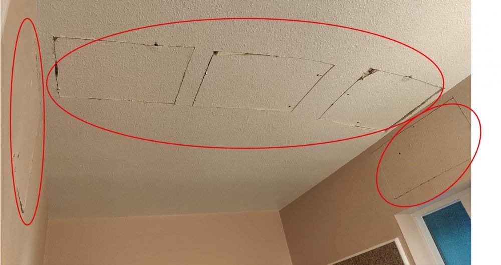 阿立注:去年9月份楼上的供水管从我家天花板等处重铺。布莱恩小哥没有理会割下来的sheetrock(石膏板)。因为他们是水管工,不管这种事。邻居中东老太太找了一个南美大叔来修补,花了3千刀($3,000),然后再找一个南美油漆哥,花了1千5百刀($1,500)。这次布莱恩小哥帮我把sheetrock都装回去了。之后我只要请人来patch、油漆即可,应该能省钱。