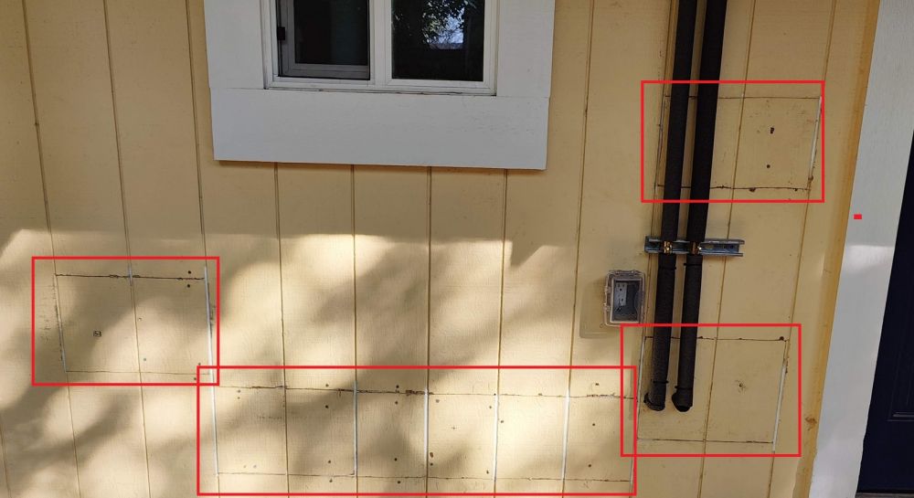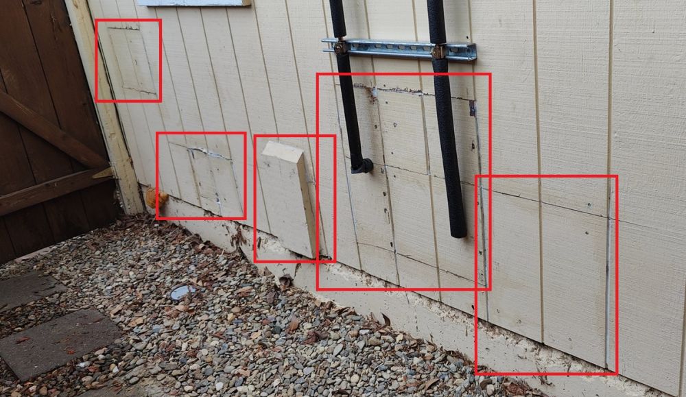 马克大叔在后院把所有墙上的割板与墙的接缝用硅胶密封(seal with silicone)。。。