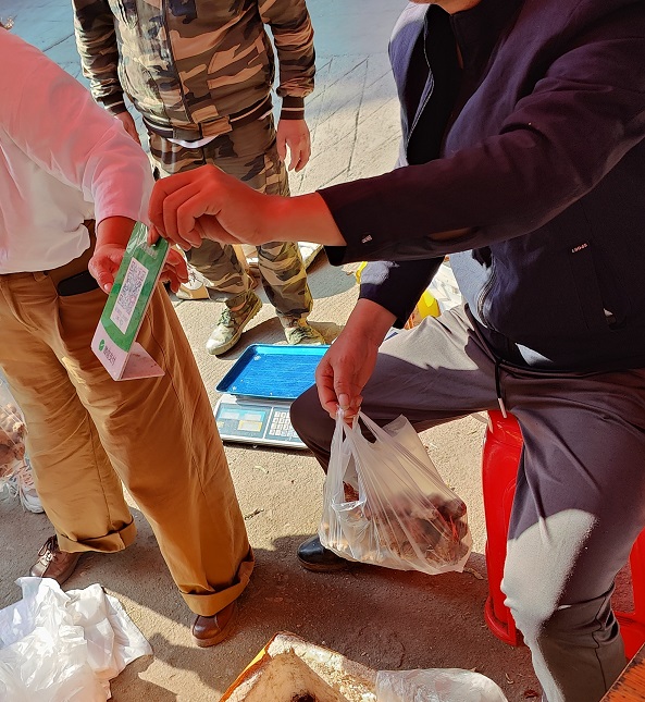 庄大嫂也是有备而来,大包、小包的笑得合不拢嘴:“买了只乌骨鸡,我们孙子要吃的。买了五花肉,我们孙子要吃的。买了这、买了那。。。(都是)我们孙子要吃的。”