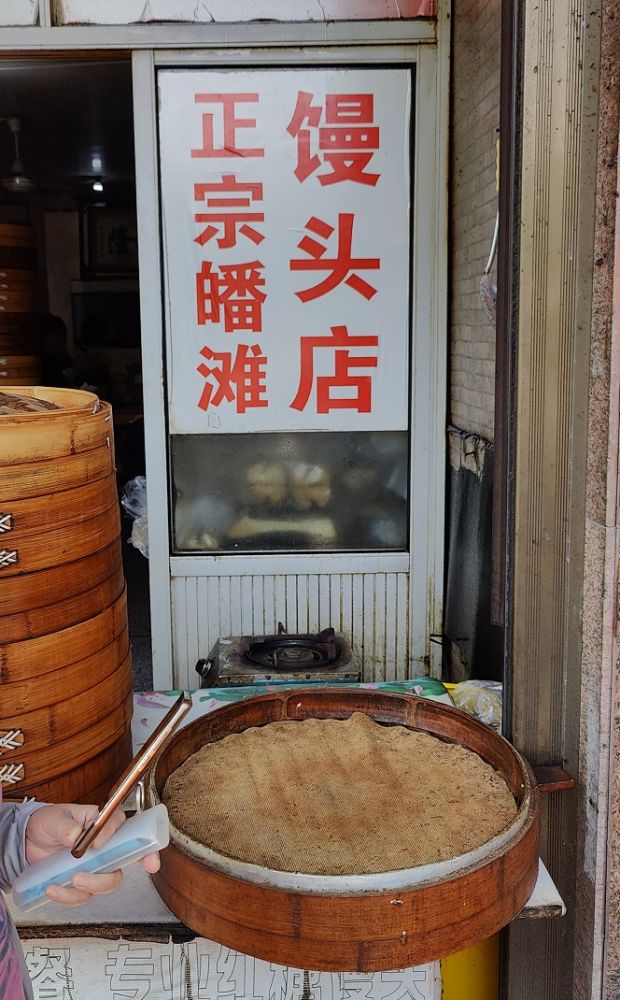 小店大名是‘馒头店’,但这大馒头不是一班的馒头,其实是发糕。小店老板、老板娘正忙乎,大蒸笼热气腾腾。