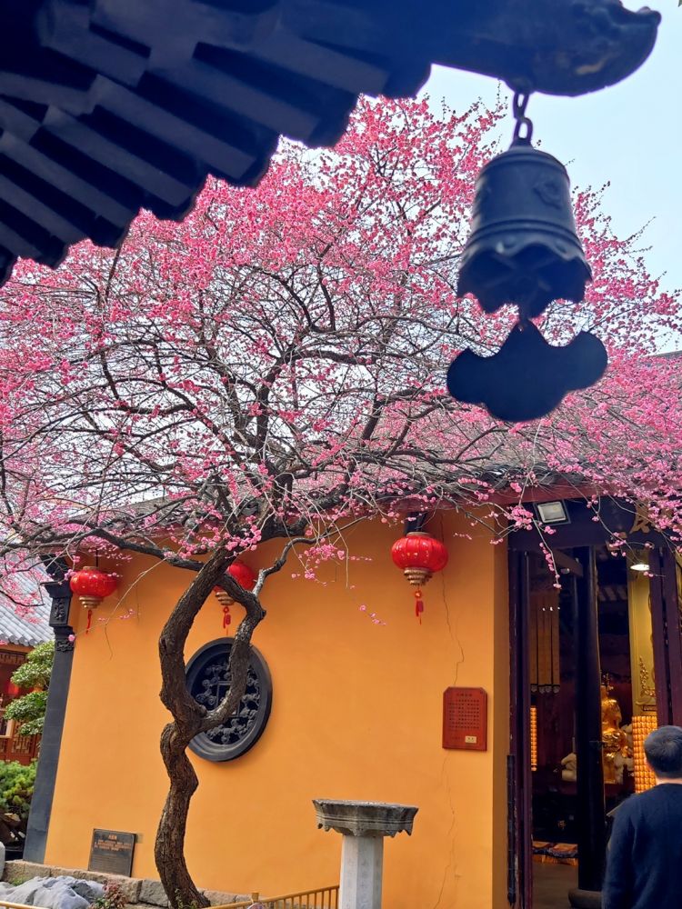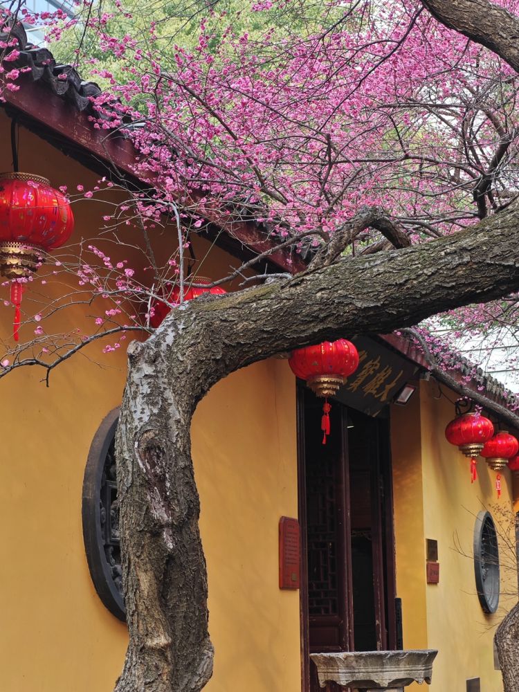 浙江湖州铁佛寺以大雄宝殿前两株百年“六瓣红梅”闻名(寻常梅花五瓣)。古寺黄墙黛瓦与绚烂红梅交相辉映,禅意浓郁。这两株百年红梅分别状若游龙和凤冠,被誉为江南梅花“顶流”。