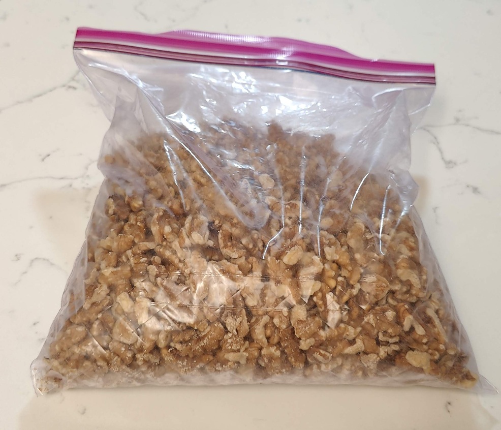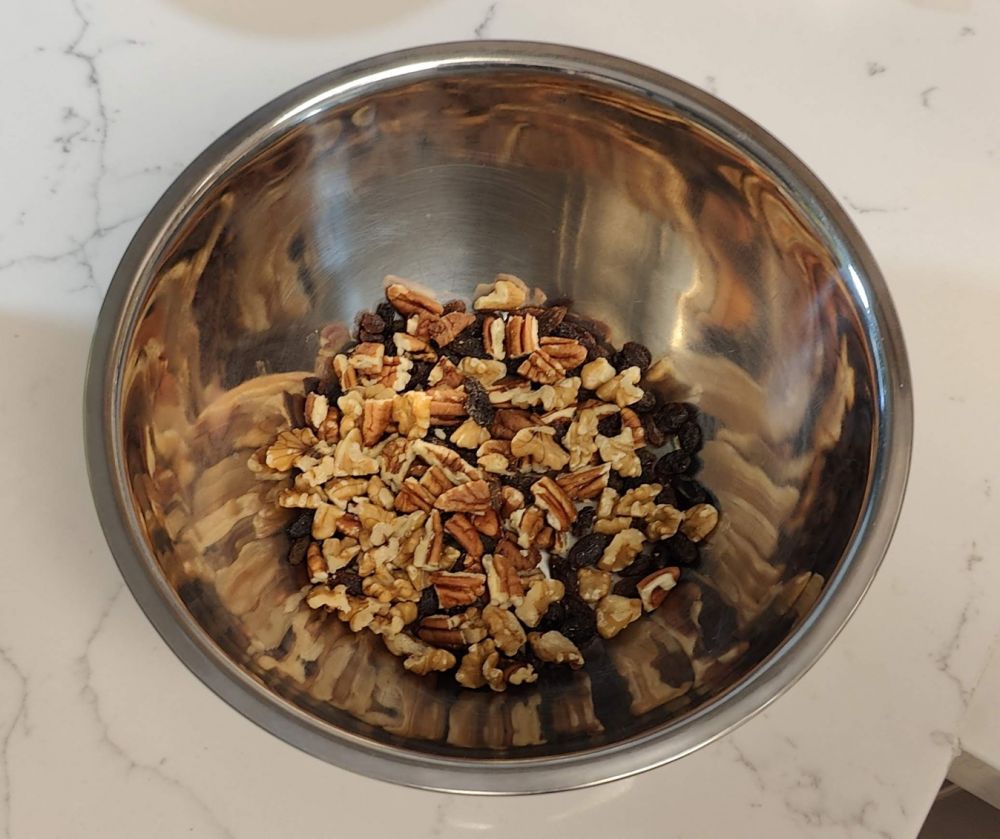 Pecan和walnuts切切小,所有咚咚放到大碗中(拍照时还没加桂圆):