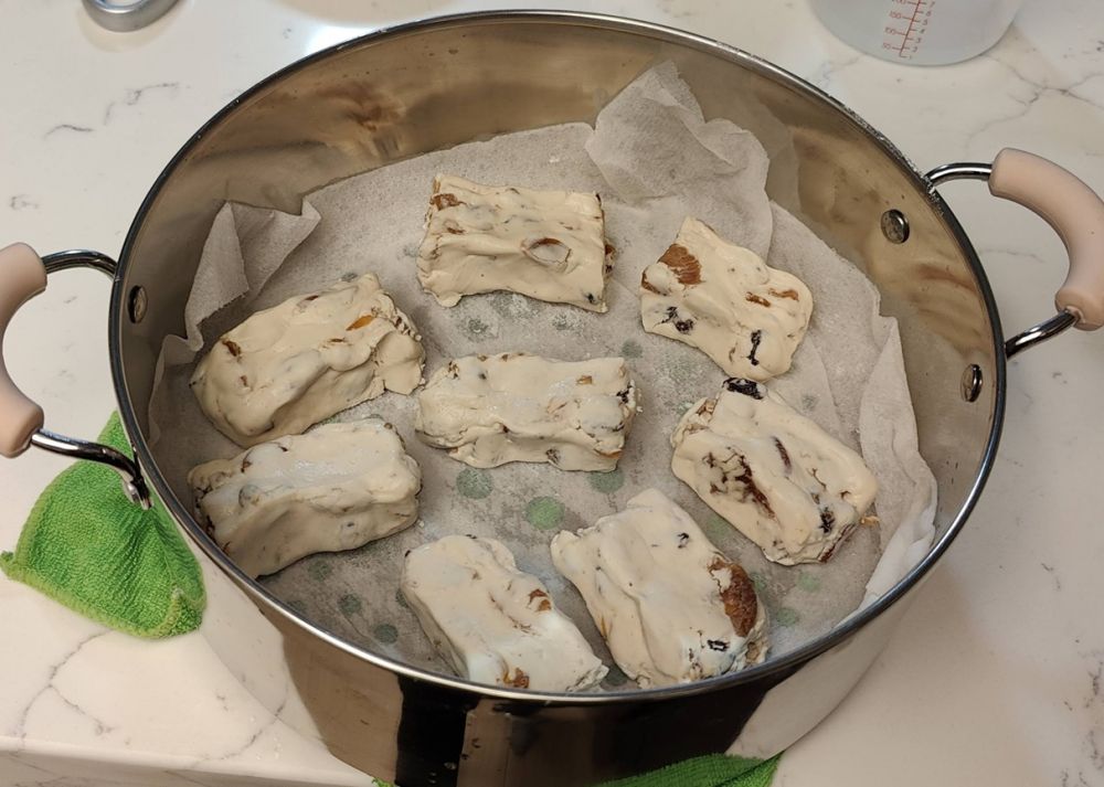 面团掐出三分之一的样子,捏成长方形,切成3断,放入蒸锅;如此这般,一共切成8块。