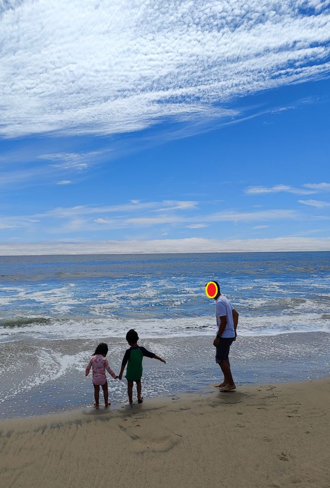 两孩子的鞋子都留在车上,海滩赤脚爽。但潮汐池看来要上另一边的岩石坡,赤脚或许危险?