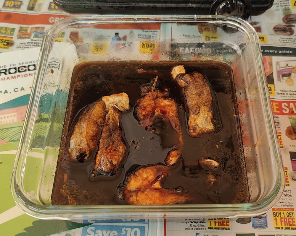 正宗杭州熏鱼(又叫酥鱼)用的是草鱼。楼外楼的熏鱼,草鱼是养在西湖里里的鲜活草鱼。米国买不到草鱼。根据早年阿立嫂、之后阿立兄的几番推敲,最价廉物美的当属考试特抠(COSTCO)的鳟鱼。