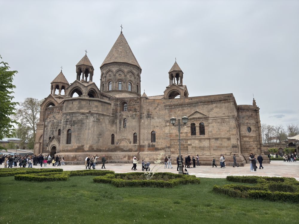 比这座教堂更重要的是阿拉拉特山,这是亚美尼亚人心目中的圣山。根据圣经记载,公元前2649年爆发大洪水时,诺亚方舟就是停靠在阿拉拉特山下;洪水退后,诺亚下到山谷,种下人类第一株葡萄树。 但根据苏联在1923年与土耳其签订的边界条约,阿拉拉特山从此划给了土耳其。但即便如此,大部分的亚美尼亚人仍宣称此山为他们所有,它至今仍是亚美尼亚国徽正中央的图案;我买了一个冰箱贴,其中的图案就是阿拉拉特山,这就是亚美尼亚人的圣山和民族团结之心,更是其民族认同的象征。