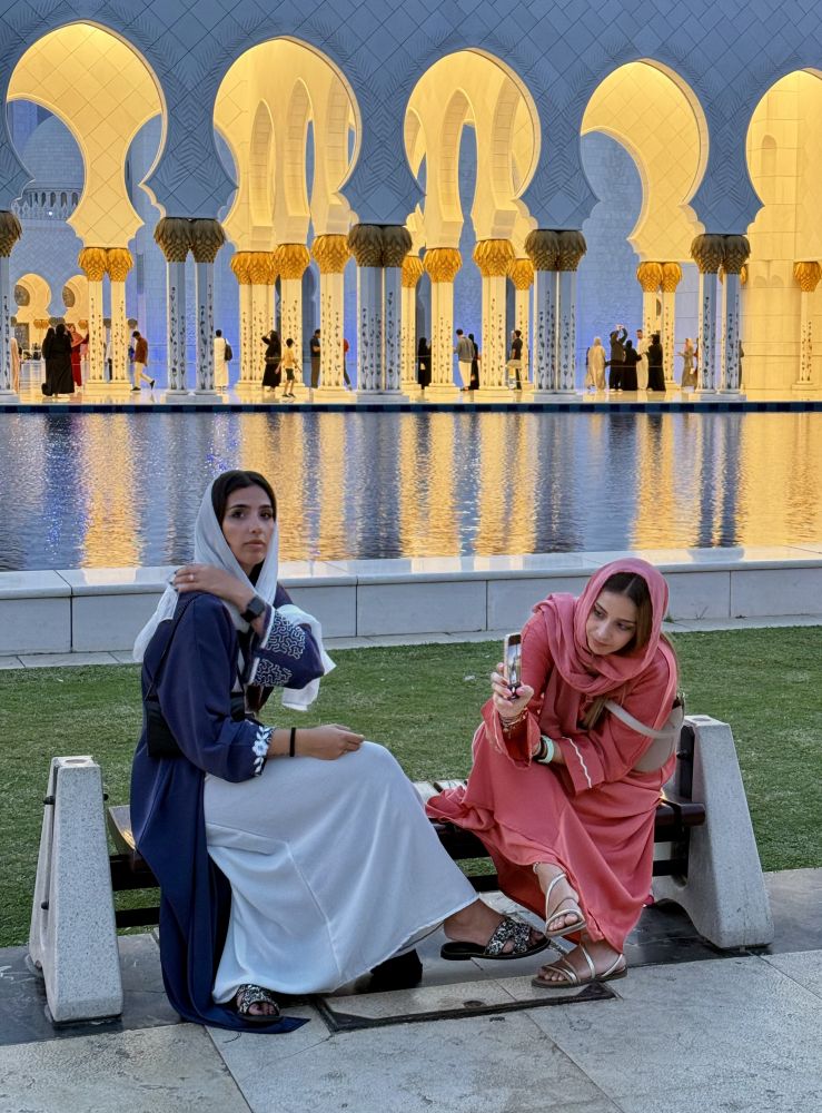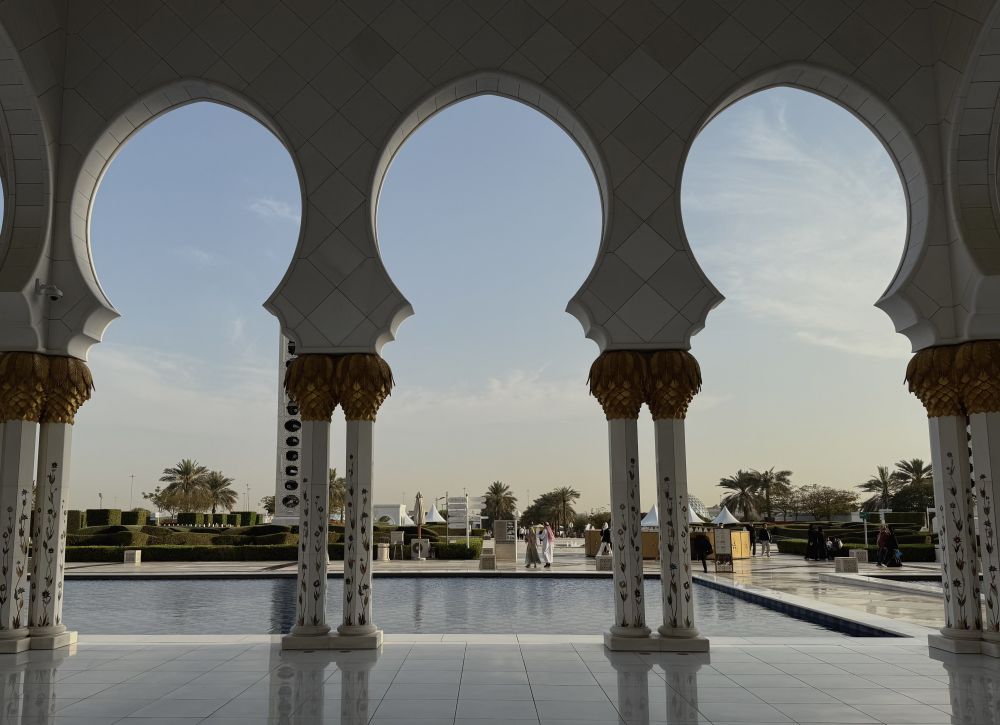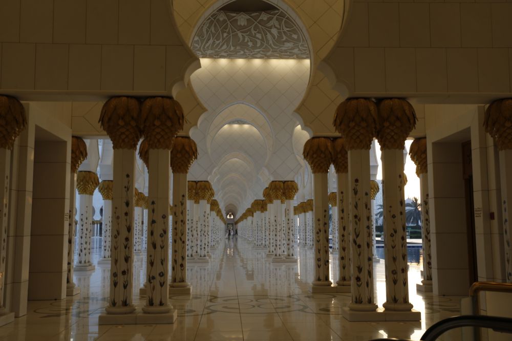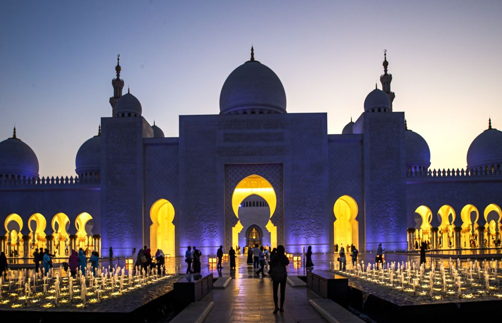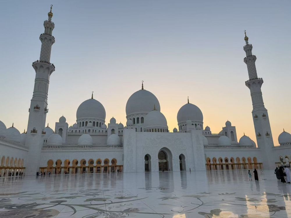 阿布扎比大清真寺是阿联酋首都阿布扎比市的标志性建筑,它历时11年建成,总面积超过555,000平方米,它是阿联酋最大的清真寺。我曾经参观过不下十座世界著名的清真寺,但就建筑艺术来说,这是我所见到的最豪华最精美的大清真寺。清真寺有八十二个圆顶、四座高107米的宣礼塔,可同时容纳五万人聚礼,其中大厅可容纳七千人,两个小厅(其中一座是女寺)可以容纳一千五百人。它的设计和建设可谓团结世界联合之作,它运用来自世界各国的艺术工匠和建筑材料, 总计有超过三千名工人和三十八家承包商参与了该清真寺的建设。