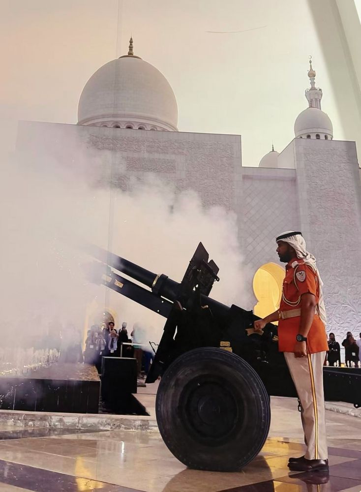 作为阿布扎比最重要的大清真寺, 在斋月期间的一个重要习俗是他们的“开斋炮”仪式。日落以前,一门礼炮被推到清真寺大门口的喷水池旁, 身穿鲜艳军服的军人站立两旁,所有观众屏住呼吸,那几分钟里整个清真寺一片寂静。随着一位军官的一声号令,礼炮轰鸣,刹时间全场沸腾。数千人的脸上都露出热情洋溢的表情,整个大清真寺周围的绿地上成了一片野餐的海洋。