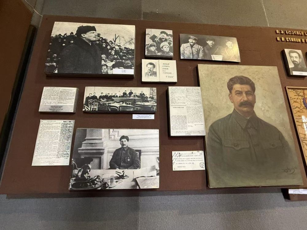 纪念馆是一栋具有当地建筑风格的二层小楼,由于维护经费有限,小楼内外看上去有点陈旧。 入门后只见红地毯一直延伸至二层斯大林的雕像前,这座雕像的个头约是普通人身高的2倍。 整个纪念馆分成七八个展厅,展示了从斯大林的童年时代开始,直到他逝世期间的“丰功伟绩“。斯大林是鞋匠的儿子和农奴的孙子, 八岁时患了天花,愈后脸上留下了抹不掉的疤痕。 他原姓朱加什维利,在15岁时改名为“斯大林”,在俄文中的意思就是钢铁, 他以此明志,来表明自己坚强不屈、百折不挠的性格。斯大林在16岁时因接触革命书籍而参加革命活动, 此后因此被逮捕7次、流放6次,还从流放地逃出5次。