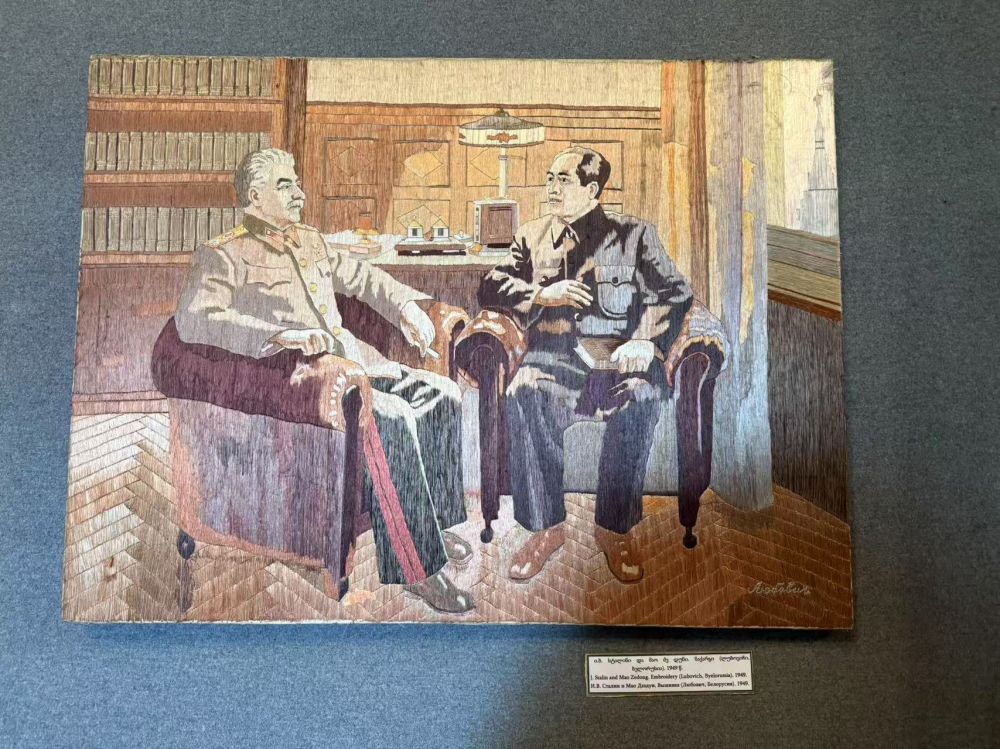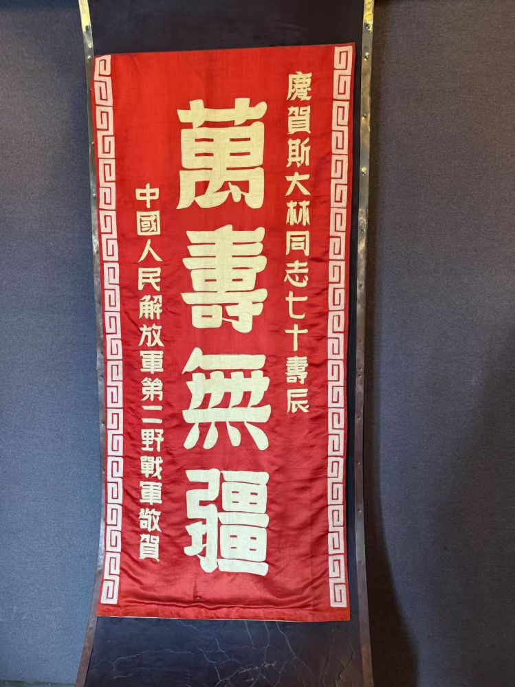 引人注目的是中国各界为斯大林七十大寿赠送的礼品,包括一幅题有“万寿无疆”的红绸缎,一个桃子形状的红色沙发靠垫,和一副祝寿红绸。 还有一幅斯大林和毛泽东会晤的刺绣画,照片中斯大林的体态要比毛泽东健壮的多,但实际上斯大林的身高是1.62米,而毛泽东的身高至少 1.73, 这一类的宣传画在当时很常见。