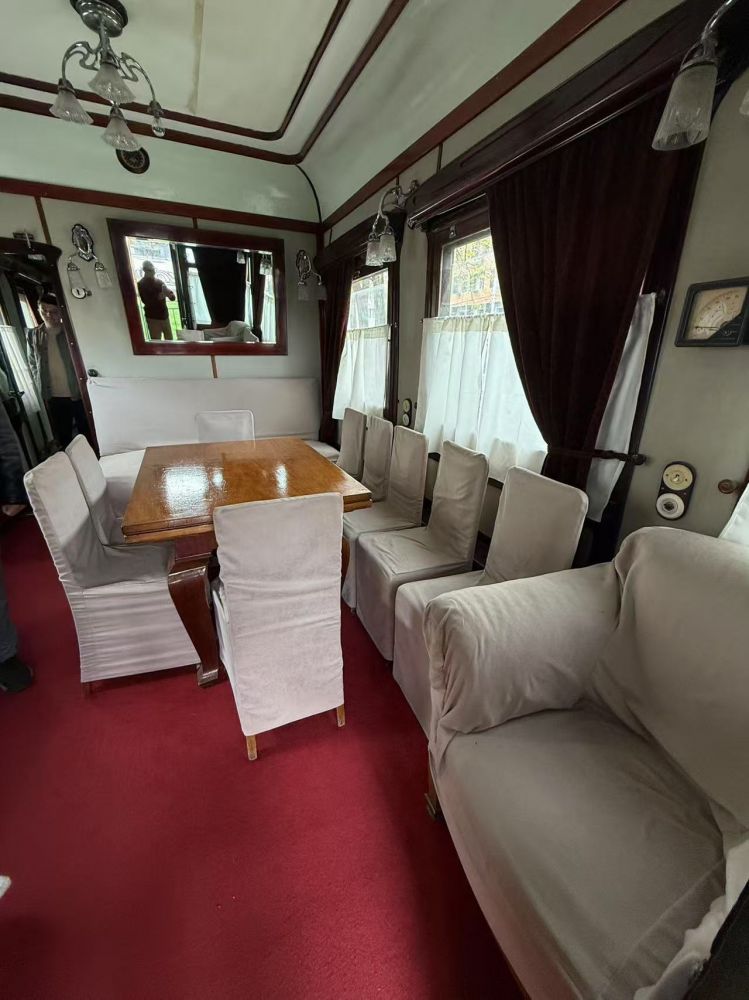 纪念馆外停放着一列火车车厢,斯大林在二战期间就乘坐这个专列参加了德黑兰会议和雅尔塔会议。专列上有小型会议室、卧房、随员和警卫员房间, 各种设施齐全,谈不上豪华。解说员特地介绍说,照片右边的沙发,是斯大林在专列上经常坐的。