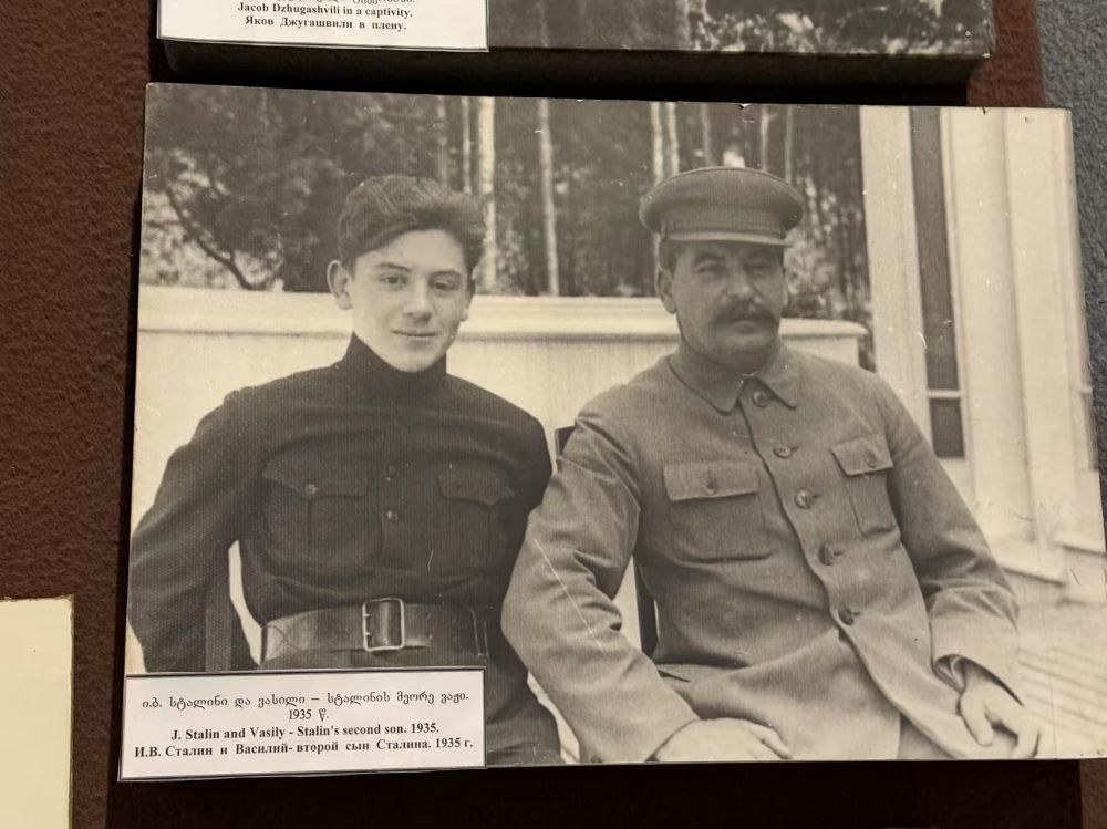 纪念馆的一个展柜陈列了斯大林的两位妻子和三位子女的照片和物品,他们的命运使我唏嘘不已: 斯大林的第一任妻子是格鲁吉亚姑娘叶卡捷琳娜·斯瓦尼泽,她以做裁缝为生。他们的儿子雅可夫于次年3月来到人间。此后叶卡捷琳娜经常患病,由于斯大林当时没钱为她看病, 她于1907年死于肺病, 年仅22岁。