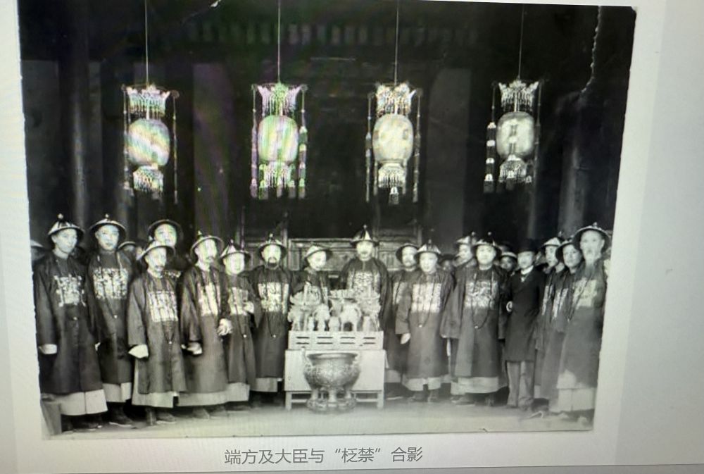 端方得到这套青铜器后非常得意,不仅请来同僚一起欣赏,还当场摆拍了一张照片——在当时拍照可是了不得的时髦物事,留下了珍贵的影像记录。1908年,端方出版了《陶斋吉金录》, 在这本收录他的青铜器收藏的书中,排在目录第一位的,就是这套青铜器。端方在研究之后,将这套柉禁中的每件青铜器都认真地考证及描摹,其中的11件均带有铭文。