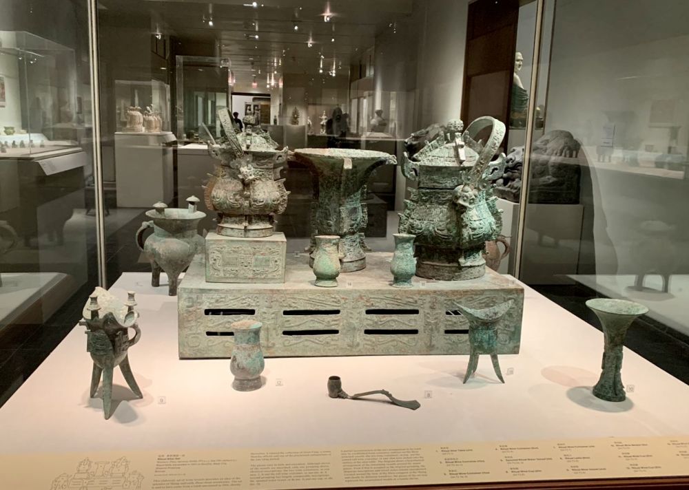 此套器皿在大都会博物馆的青铜器收藏中名列首位,我先后去过大都会博物馆十余次,只亲眼看到过两次。其余的时间,这件珍宝要么被存放于内库维修保养;要么“出差”, 借给各地的博物馆做专题展。至于其中每一件器皿的欣赏,实在是超过了我的欣赏水平,我能做的就是从不同角度拍摄这套宝物,除此之外确实没有能力讨论其中每一件酒器。