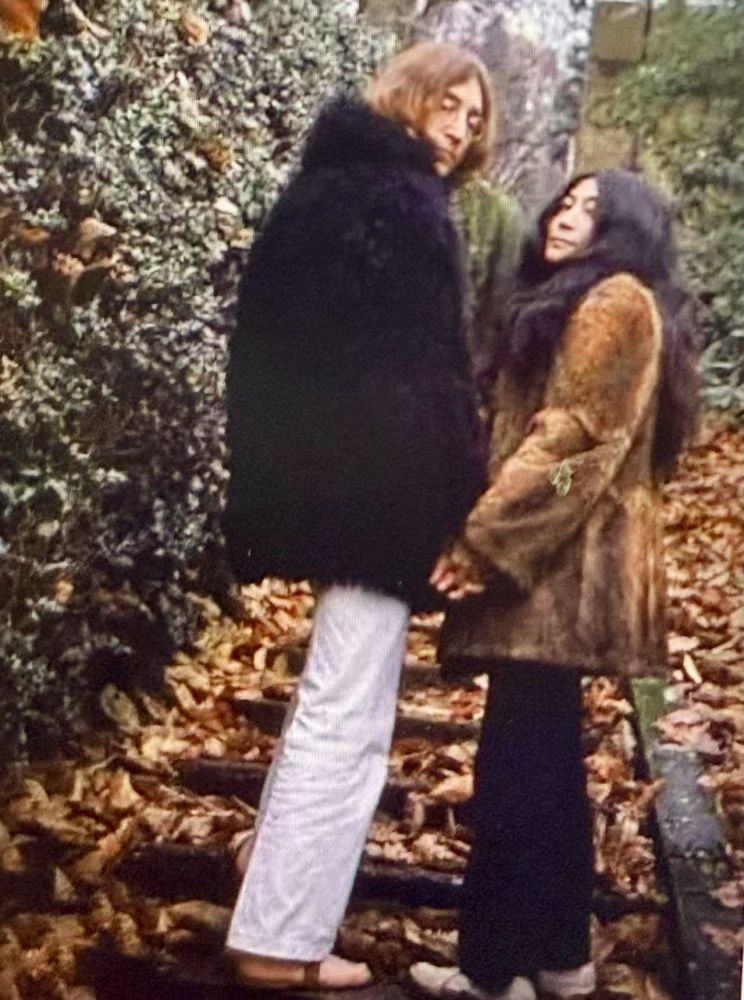 使列侬具有全球知名度的还有他与日裔美籍艺术家小野洋子的“世纪之爱“。他们的爱情在一开始并不被接受,那时列侬和前妻的婚姻虽陷入死水,但毕竟还没离婚;小野洋子本身则经历了两段婚姻,还有一个女儿。 披头士的其他三位成员都不喜欢洋子,乐团的粉丝们还称她为“女巫”或“日本鬼子”。但即便如此,列侬仍不顾一切高调地爱着比他大8岁的洋子,甚至把自己的名字改成了约翰小野列侬。 列侬丝毫不畏惧在世界面前展示他对洋子的爱,两人时时刻刻牵手走在一起。1968 年,这对恋人拍下了这张照片,列侬自嘲道:“俗话说的好,每个白痴背后,总有个伟大的女人。”洋子则说,“至少我拥有一个理解我的人”。