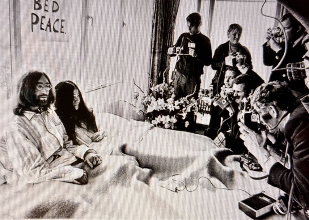 更使他们名满天下的是两人反对越南战争的态度。1969 年 3 月 25 日,列侬夫妇在荷兰阿姆斯特丹希尔顿酒店的总统套房发起了著名的“床上和平运动”。这对夫妇穿着睡衣躺在床上整整七天,房间里贴满了反越战标语,俩人不停地接受记者和政治家的访问和拍照,强烈反对美国发动的越南战争。