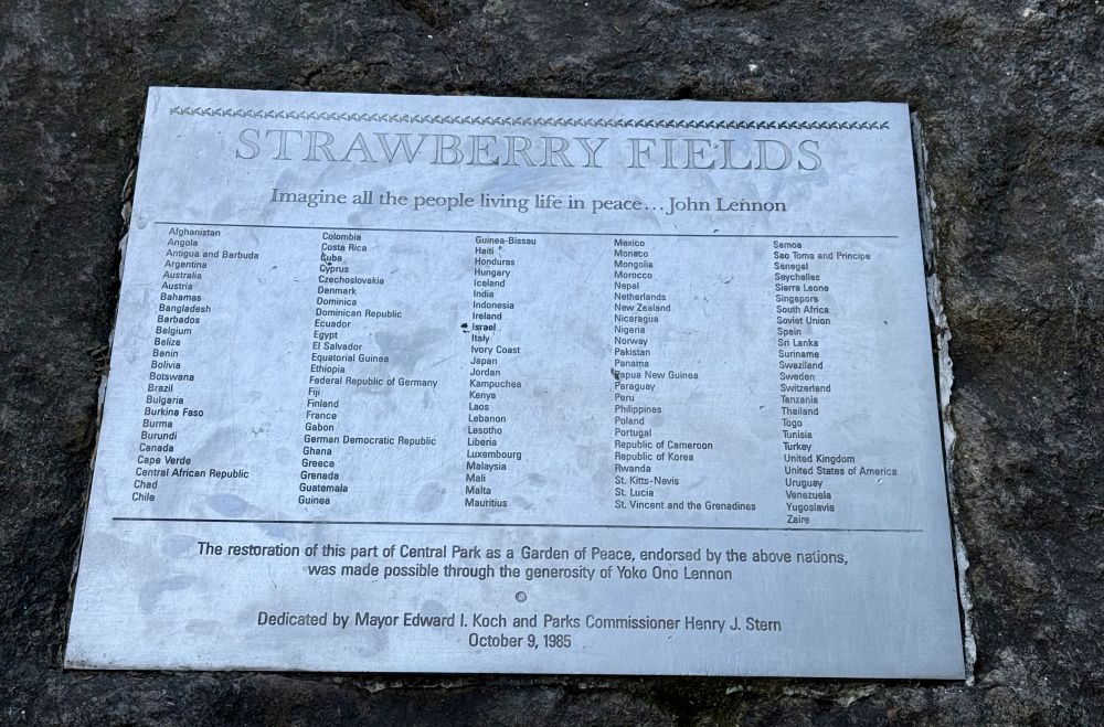 暗杀事件四十五年后的今天,仍有不少游路人在IMAGINE的图案前拍照留念和追思,旁边有一位歌手在弹唱列侬的歌曲,游人们安静地坐在周围的长椅上,聆听着列侬当年创作的歌曲。 在结束本篇之时,我再看了一遍列侬的《Imagine》视频,片中列侬和小野洋子是如此恩爱,也许这就是人们常说的“命”。。。。。。