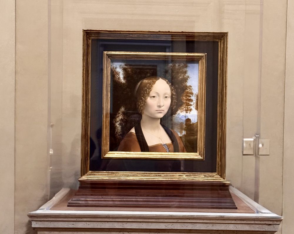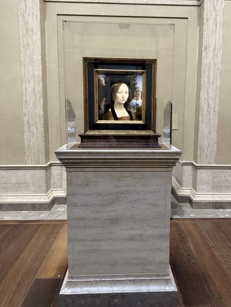美术馆的镇馆之宝是达芬奇著名三大肖像画之一的《吉内薇拉·班琪》,这是美国博物馆收藏的唯一一幅达芬奇作品。 达芬奇共有十九件画作, 画中的吉内薇拉?班琪时年16岁,其家族的财富仅次于美第奇家族,这幅画是达芬奇在她订婚时所绘制。 女主人公眼睑微微低垂,嘴角抿住,与《蒙娜丽莎》神秘的微笑不同,仿佛有些忧郁和对未来婚姻的无奈。在此之前的女士肖像通常都是侧面像,但达芬奇选择将吉内薇拉置于正侧面视野,向我们显示了她更多容貌特征和个性。 观众们只要看一眼画作,就会有一种眼前一亮并被其迷倒的感觉。达芬奇作品之所以不同于其他人的作品,原因就在于这种令人心醉神迷的吸引力。