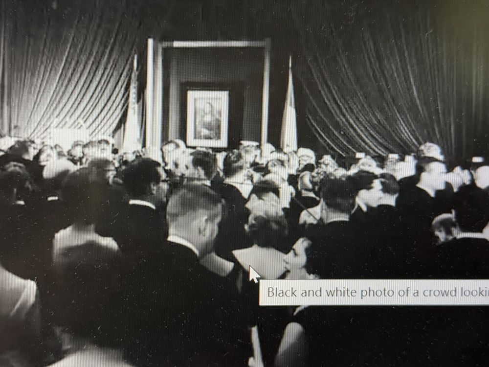 由于太珍贵,此画被玻璃罩子罩着展出, 周围始终围了几十号人,物以稀为贵嘛。此时不知哪位参观者不慎把手机掉落在地上,原本极其安静的参观者都被吓到了,马上就有三四位保安围过来,随时准备“反恐“。