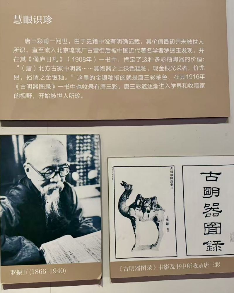 “唐三彩”一词其实并不见于古代文献,清末建造陇海铁路时,在洛阳城北邙山的施工中,发现了大量唐代墓葬,出土了众多从未见过的彩釉陶器。一些古董商将其运至北京,引起了罗振玉等学者的高度重视。 随着大量唐三彩随葬品的问世, 和修复后美轮美奂的唐三彩作品,引发了一波又一波收藏唐三彩的热潮。 其实唐三彩的制作已有1300多年的历史,在此之前的泥俑多为单色釉,汉代时期发展到黄色和绿色两种彩釉,在唐朝时期则出现了三彩和多彩釉。唐三彩制作工艺复杂,以经过精细加工的高岭土作为坯体,用含铜、铁、钴、锰、金等矿物作为釉料的着色剂,并在釉中加入适量的炼铅熔渣和铅灰作为助剂。先将素坯入窑焙烧,陶坯烧成后,再上釉彩,再次入窑烧至800℃左右而成。它最显著的特点是色彩丰富,以黄、绿、白为主,并辅以蓝、褐、紫等色彩,形成斑斓夺目的视觉效果。
