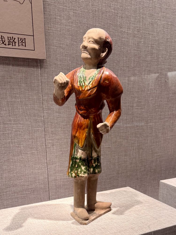 另一件三彩釉陶胡俑高 29 厘米,俑络腮胡须,深目高鼻,身着无右袖翻领长袍,腰间系带,内穿至膝短衣,足踏高靴,为西域装束,全身施以黄、绿、白三色釉,其威风凛凛的形象给观众留下深刻印象。