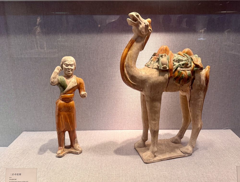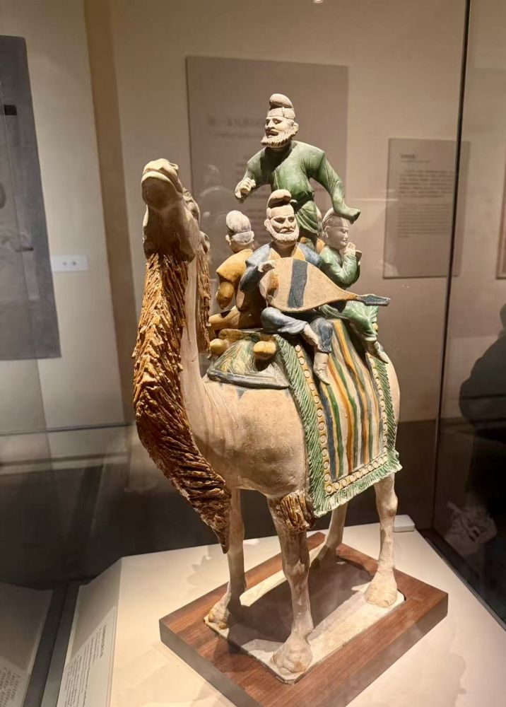 除洛阳博物馆外,国内几乎任何一个省级博物馆里都有唐三彩展品; 其中国家博物馆收藏的几件唐三彩作品更是传世之作:如三彩釉陶骆驼载乐俑,这是国博的镇馆之宝之一。 骆驼的头高 58.4 厘米,首尾长 43.4 厘米,立俑高 25.1 厘米。骆驼昂首挺立,驮载着 5 名男子,中间是一位胡人舞者,身着绿袍挥袖而舞,周围 4 名乐手分别演奏琵琶、筚篥及鼓等西域乐器,生动展现了唐代丝绸之路上胡汉文化交融的盛景。