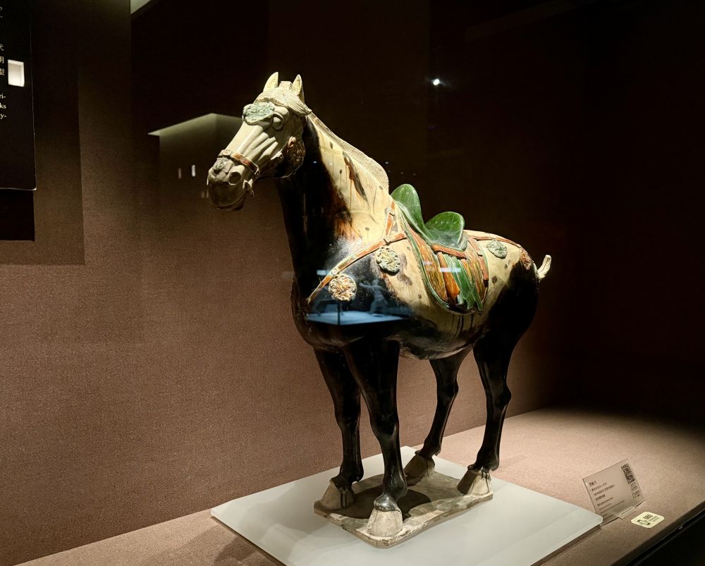 第二类是动物,如马、骆驼、牛、羊、狮、虎等; 馆中展出的一件三彩黑釉马是镇馆之宝。它通高 73 厘米、长 84 厘米,四足挺立、头颈上昂、眼视前方,膘肥体壮且肌肉线条流畅;其通体乌黑如墨,唯有面部、鬃毛、四蹄如雪,马鞍上还装饰有 15 枚或绿、或棕的釉彩浮雕垂饰,绚丽夺目。马匹造型比例精准,肌肉线条饱满流畅,黑釉如漆、白釉似雪,色彩对比强烈且釉面光洁莹润,是唐代工匠对唐三彩釉料配方、烧制技术掌握程度的巅峰体现,堪称盛唐手工业的 “活标本”。 黑釉三彩在唐代极为罕见,全国仅存两件,另一件收藏于中国国家博物馆,其工艺价值和稀缺性不言而喻。