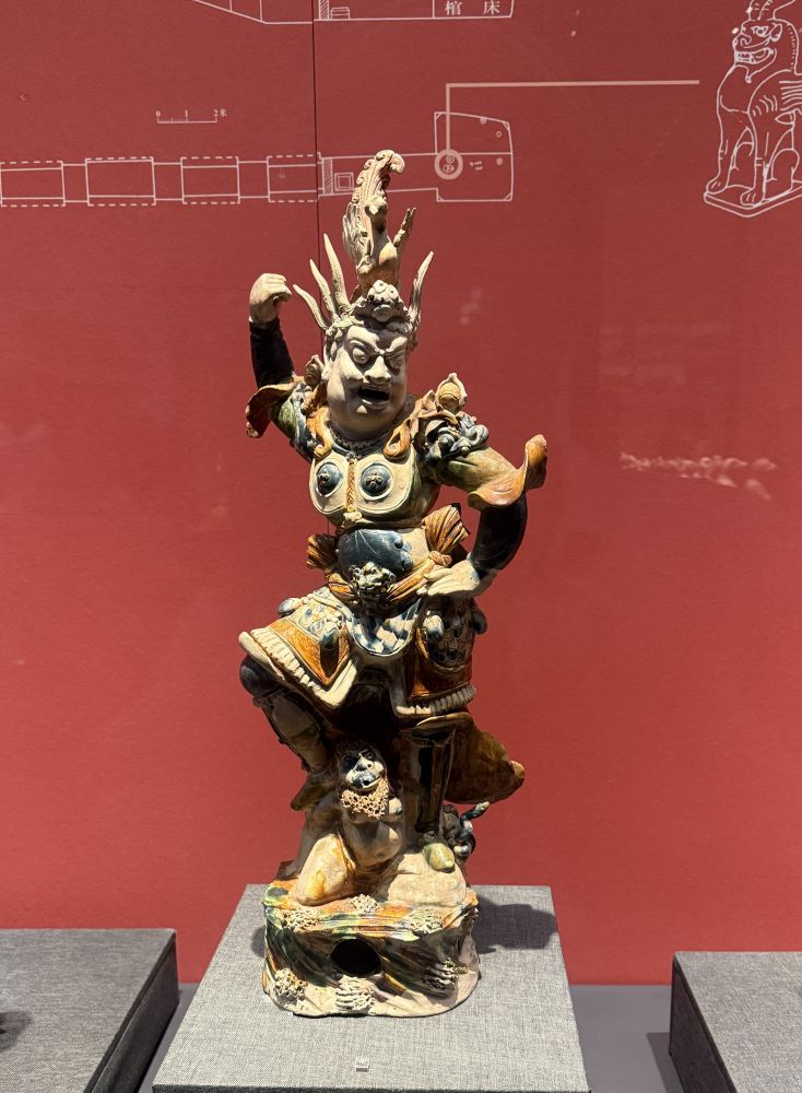 唐三彩专题展中的作品主要分为四类:第一类是人物,有文臣、武将、贵妇、男僮、女仆、艺人、胡人等;既有雍容华贵的贵妇、英武威猛的武士,还有各种乐舞俑、侍女俑等,体现唐代社会的多元风貌。