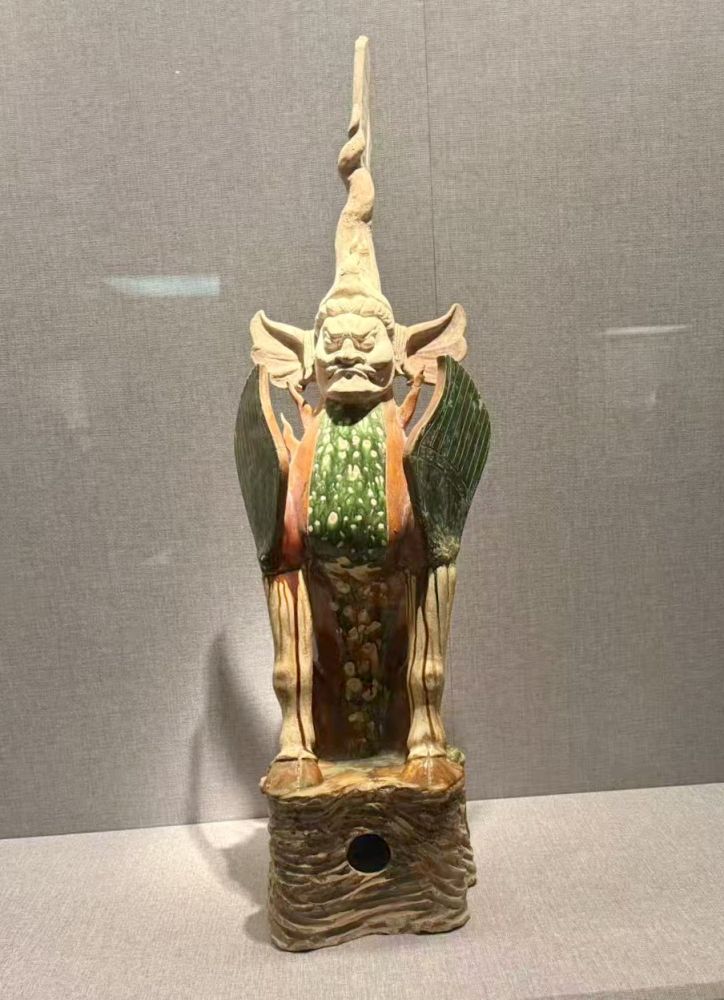第三类是冥器,多为镇墓兽。唐代国力强盛,社会经济繁荣,上至皇室贵族、下至富商大贾,都盛行厚葬之风。当时的人们秉持 “事死如事生” 的丧葬观念,认为墓葬是逝者在另一个世界的居所,需要放置大量的冥器(陪葬品)来保障其生活、守护其安宁。镇墓兽就是这类冥器中最重要的 “守护神”;通常成对摆放在墓道或墓室门口,承担驱邪避凶、守护墓主的职责。 镇墓兽的造型就体现了这种融合性:其 “人面兽身”“独角双翼” 的形象,既吸纳了中国本土神话中神兽(如貔貅、饕餮)的元素,又融入了西域文化中翼兽的特征;部分镇墓兽的面部带有胡人样貌,正是当时民族交融的直观体现。 传统道教的神仙体系、辟邪观念,让镇墓兽被赋予了 “震慑鬼魅” 的超自然力量;而佛教中的护法神兽形象(如金刚、力士),则为镇墓兽狰狞威严的面部表情、健壮有力的体态提供了参照。