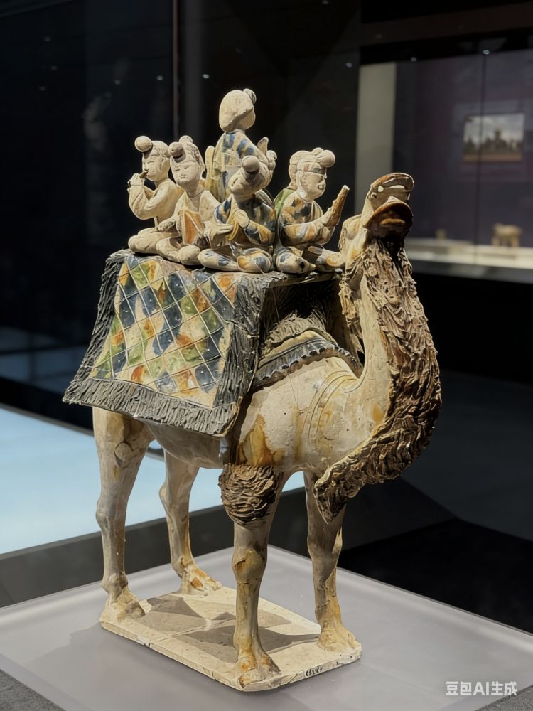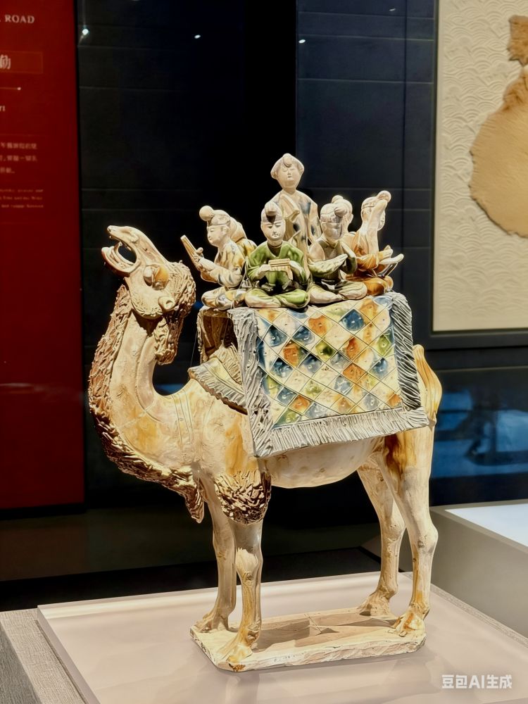 陕西历史博物馆也收藏有众多精美的唐三彩文物,其中最具代表性的是唐三彩骆驼载乐俑。它通高 56.2 厘米,长 41 厘米,骆驼高 48.5 厘米,施蓝、绿、黄等单色釉。骆驼昂首直立于长方形座上,张口嘶鸣。驼背铺有带花边圆形垫子,其上搭一平台,覆盖着刻花毯子。平台上有七个男乐俑盘腿朝外坐于四周,手持笙、琵琶、排箫等乐器正在演奏,中间立一体态丰腴、载歌载舞的女子。釉色鲜明亮丽,协调自然。这件文物是唐代文化艺术、制作工艺发达昌盛的重要物证,见证了丝绸之路上的交流与融合,为研究唐代雕塑艺术、音乐舞蹈等提供了宝贵资料。