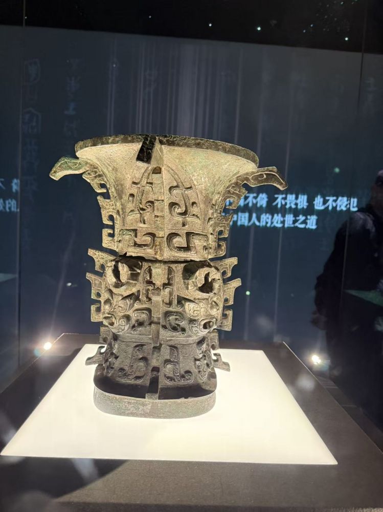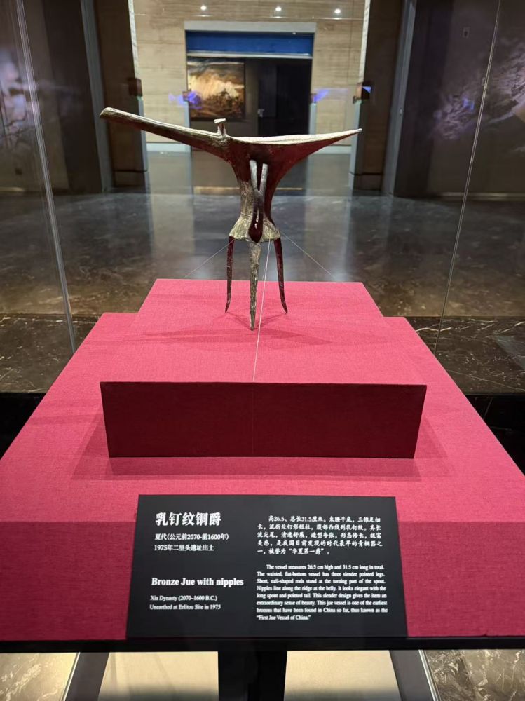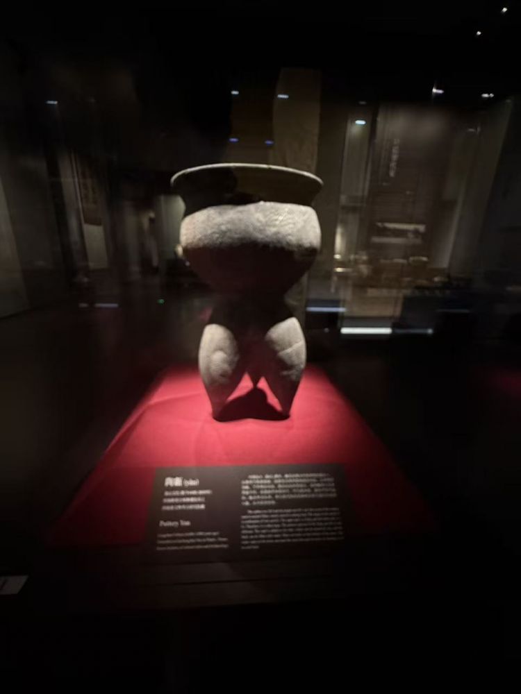 博物馆的展厅里系统地展示了六十多年的考古研究成果, 陈列了诸多的出土文物。我在此观赏了几件镇馆之宝,如被誉为“华夏第一鼎”的网格纹青铜鼎。此鼎证明当时已脱离单纯的炊具属性,成为“明贵贱,辨等列”的核心礼器,只有最高等级的贵族才能使用,这是王权集中的直接物证。