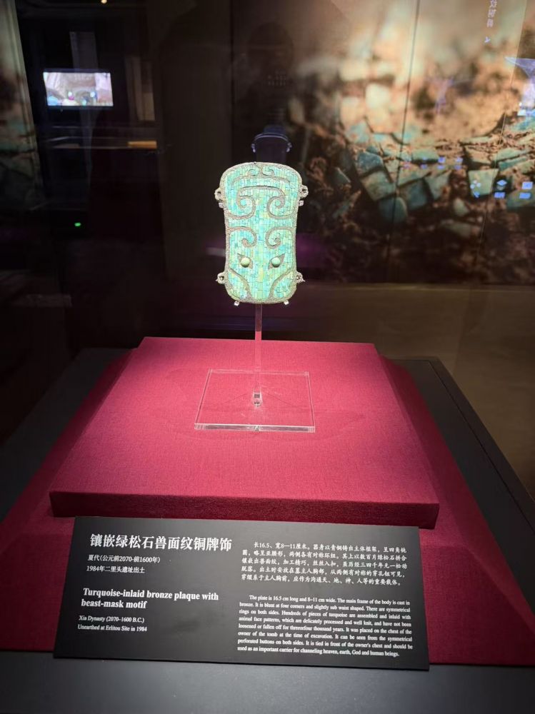镶嵌绿松石兽面铜牌饰则是以青铜铸出主体框衬,其上饰有兽面纹,镶嵌了600多块绿松石,设计精美,铸工精湛,镶工精致,图案精妙,观者无不赞叹。历经3000余年而无一松动脱落。这件牌饰出土时安放在墓主人胸部,两侧有对称的穿孔钮,可见此器应为沟通天、地、神、人的重要载体。