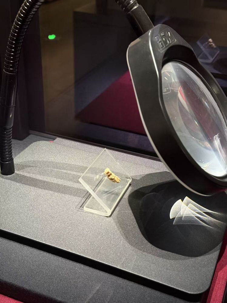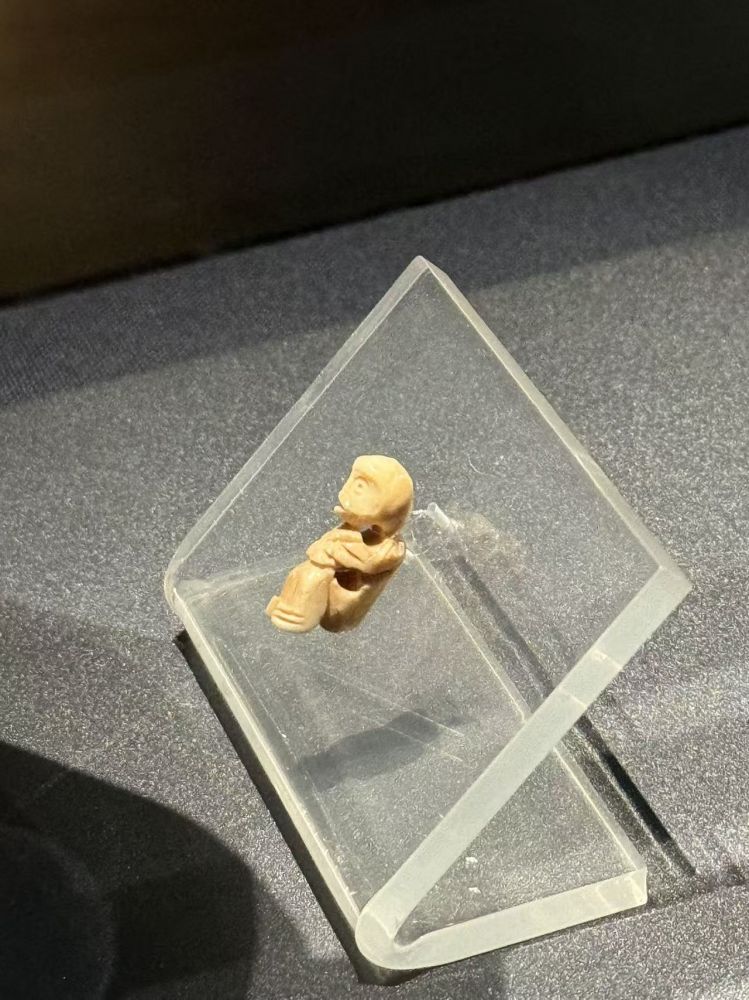展厅中的微型骨猴更是奇妙,它高仅2.2厘米、宽0.75-0.95厘米,使用动物骨骼雕刻制作,通体抛光,制作精巧,栩栩如生,是不可多得的微雕精品。这个微雕骨猴只有小指头肚大小,猴脸人身,抱膝蹲坐,透过放大镜才能看清。我实在无法想象三千多年前的先人是如何在块微小的的骨头上雕刻出如此精美的作品。