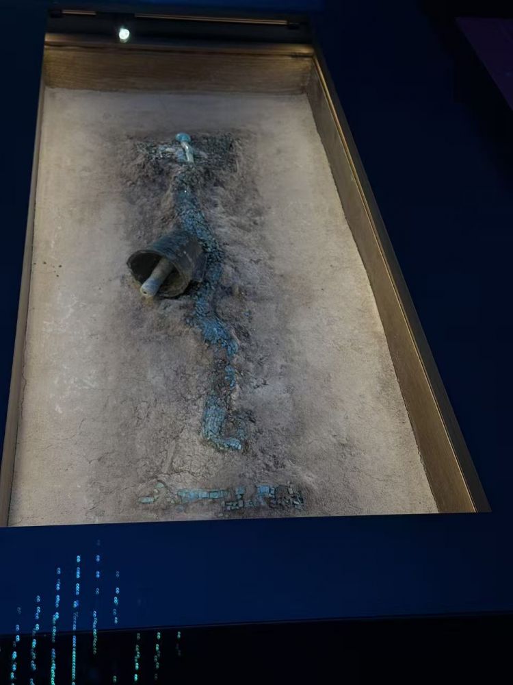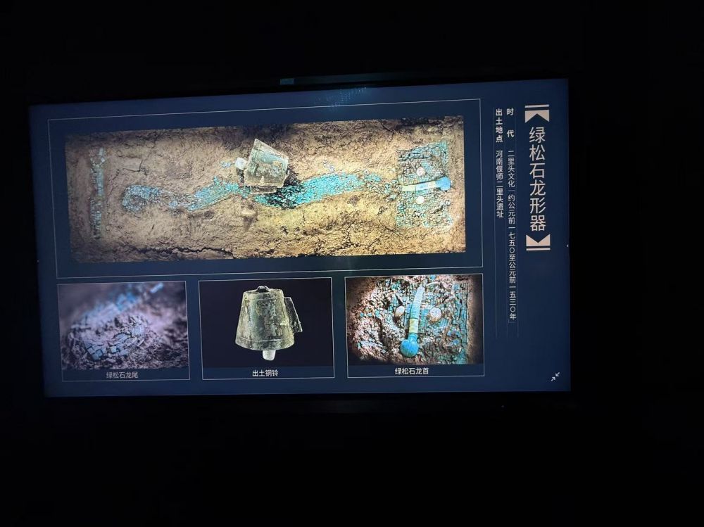 但对我来说,此行最重要的是观赏那条“绿松石龙形器”,它由两千多片绿松石组成,全长七十厘米,证明当时的先民们已经把龙作为图腾来崇拜。这条龙是华夏龙图腾最直接、最正统的根源,是华夏儿女作为“龙的传人”的最初起源和有力实证,由此被誉为“华夏第一龙”、“中华第一龙”或“中国第一龙“。 当时的考古队员们在遗址的一座贵族墓葬中发现此物,并立即意识到这绝非寻常文物,随即暂停常规发掘,改用更精细的“实验室考古”方法——在现场搭建保护棚,用石膏整体打包含文物的土层,运回实验室进行二次清理。经过数月的细致工作,这条沉睡了三千多年的“绿松石龙”终于完整地呈现在世人面前,出土时它紧贴墓主人骨架,龙首高昂朝向墓主头部,仿佛仍在履行着守护的使命。 但遗憾的是,我们看到的只是复制品,工作人员说,原件在北京的中国考古博物馆中展示,那是他们的镇馆之宝。