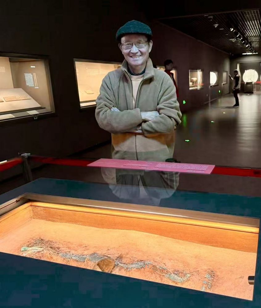 一周后,我到北京参观中国考古博物馆,这是我国第一座以考古命名的博物馆,坐落在北京奥林匹克公园旁,鸟巢体育场对面。它的外形如 “尊”,外墙高悬硕大的篆书 “史” 字。 由于地处郊区,又是专业类博物馆,比起国家博物馆来,这里的观众不算多,我得以安安静静地参观了整个下午。对我这个考古爱好者来说,这里的展品件件都值得细品,但最重要的就是这条“中华第一龙”; 在一长列的镇馆之宝中,二里头发掘的“中华第一龙”名列首位,这不仅是“镇馆之宝”,而且还是“镇国之宝”, 难怪原件要在这里保存和展出。 这条“绿松石龙形器”连同精心制作的木框被单独成列在一间光线较暗的展室中,还有一名工作人员站在展柜旁,随时提醒观众保持一定距离观赏,可见其珍贵属性。对我来说,当然要和“它”合影留念,由此得到满足感。