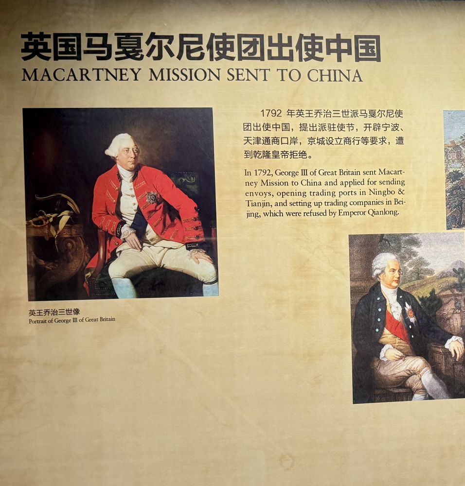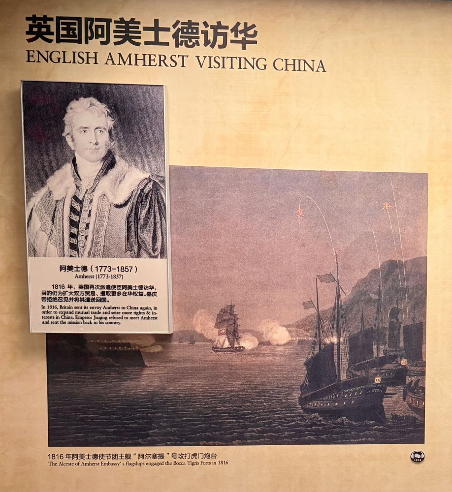 销烟池旁的博物馆里展出了虎门销烟的全过程,它其实是19 世纪中西方贸易失衡、鸦片泛滥对中国社会造成毁灭性冲击,以及清政府禁烟政策升级的必然结果。英国在18世纪的工业革命后, 迅速向全球扩张。1792 年英国特使马戛尔尼使团访华,以祝寿为名谋求通商与外交关系; 1793 年 9 月在北京觐见了乾隆皇帝。代表团要求清政府开放通商口岸,减免关税、提供贸易居留地、协定关税等,目的是打开中国市场。 由于代表团不愿按照清朝礼节向皇帝下跪请安,乾隆帝龙颜不悦,草草打发了该代表团。1816 年英国再次派遣阿美士德使团访华,由于代表团还是不愿为皇帝下跪,嘉庆皇帝立即驱逐了他们,这成为鸦片战争前中英关系恶化的关键节点。