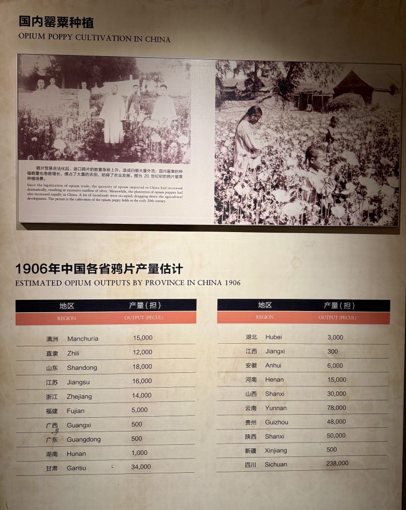 在历史教科书里,虎门销烟和鸦片战争的故事到此似乎结束了。但有意思的是,博物馆里还展出了此后的情况。战争后进口鸦片数量上升,白银持续外流、财政吃紧。“以土抵洋”逐渐成为清廷的主流意见, 认为土药(国产鸦片)成本低、税收可控,可夺洋商利权并增税。清廷于是在各地设 “土药局”,征收 “土药税”(其实就是鸦片税), 以价格与税收双重挤压洋药 (进口鸦片)。各地政府也纷纷鼓励农民种植鸦片,云贵川、陕甘、晋冀鲁豫等地由此成为鸦片主产区,云南一度竟有三分之一的耕地种罂粟。 “土药税“由此成为清廷的重要财源。 十九世纪后半段,鸦片税一直占全国财政收入的 10%左右,成为北洋水师、救灾、河工等的重要经费来源。