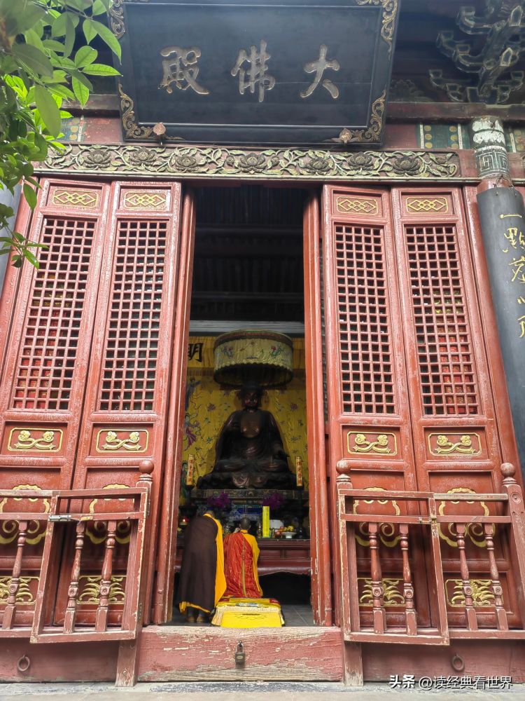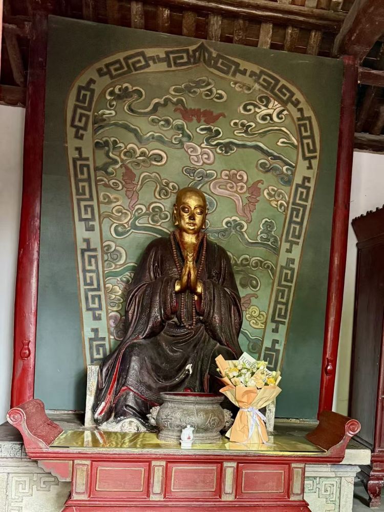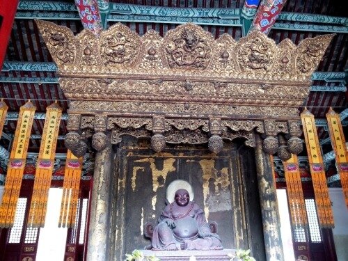天王殿内明代的弥勒佛像,是以五代时期布袋和尚为原型的弥勒菩萨化身像,袒胸露腹、笑容可掬,是汉传佛教中最广为人知的形象之一。 它采用夹纻干漆造像,工艺轻巧坚固、色泽鲜亮,是中国古代雕塑艺术的珍品。