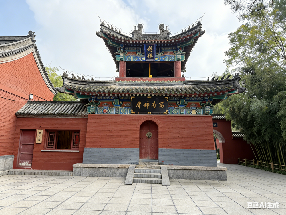 寺内东南角的钟楼为明清风格的重檐歇山顶楼阁,红墙灰瓦,斗拱彩绘,是白马寺中轴线东侧的重要配殿,与西侧的鼓楼对称分布。上层匾额为 “钟楼”,下层匾额为 “马寺钟声”,这是洛阳八大景之一。寺内大钟为元代所铸,早已不存,现有大钟为现代重铸。清晨撞钟时,钟声可远传十余里,这是白马寺的标志性景观。