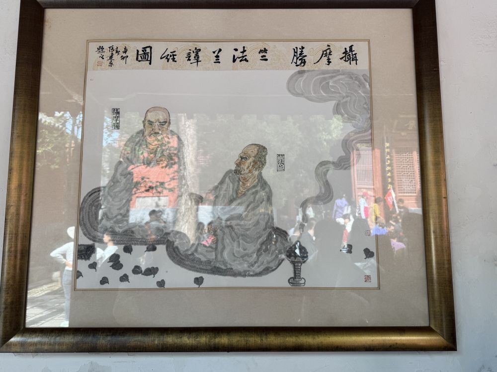 首先是它的核心宗教定位:被公认为 “释源”(释教发源地)和 “祖庭”,享有 “中国第一古刹”之称。 “祖庭”是指一个佛教宗派的发源地,或开山祖师所在的寺院,是这个宗派的 “老家”或“根”。白马寺不仅是译经道场,更是中原第一座传戒道场。曹魏嘉平二年(公元250年),朱士行(陕西人) 在此成为中国第一位按完整佛教戒律登坛受戒的出家僧人;他的受戒,标志着佛教从 “胡僧之教” 正式转向有本土僧团的宗教,打破了儒家 “身体发肤,受之父母” 的传统束缚。白马寺内陈列着一副近代工笔画,描绘朱士行在白马寺戒坛受戒的场景,色彩典雅,人物神情庄重。