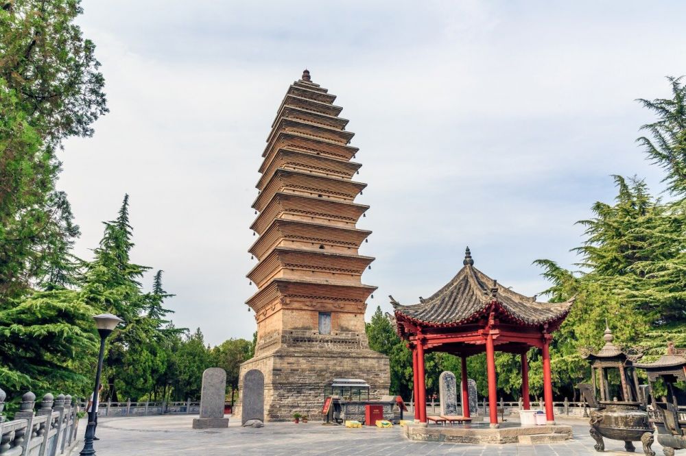 位于白马寺山门东侧的齐云塔是一座四方形密檐式砖塔,共13 层,总高 35 米,始建于东汉永平十二年(69 年),为洛阳地区现存最早的地面古建筑。 它依天竺样式在 “圣冢”(佛舍利传说地)上建九层木塔,名 “齐云”,寓意高耸入云。