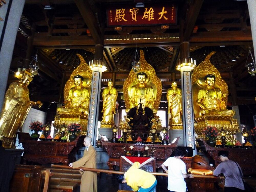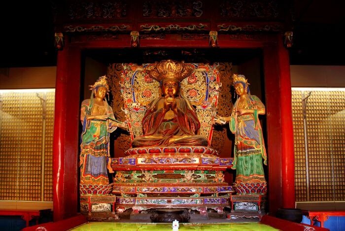 大雄宝殿内的三主佛为元代夹纻干漆造像,从左到右分别是药师佛、释迦牟尼佛、阿弥陀佛。